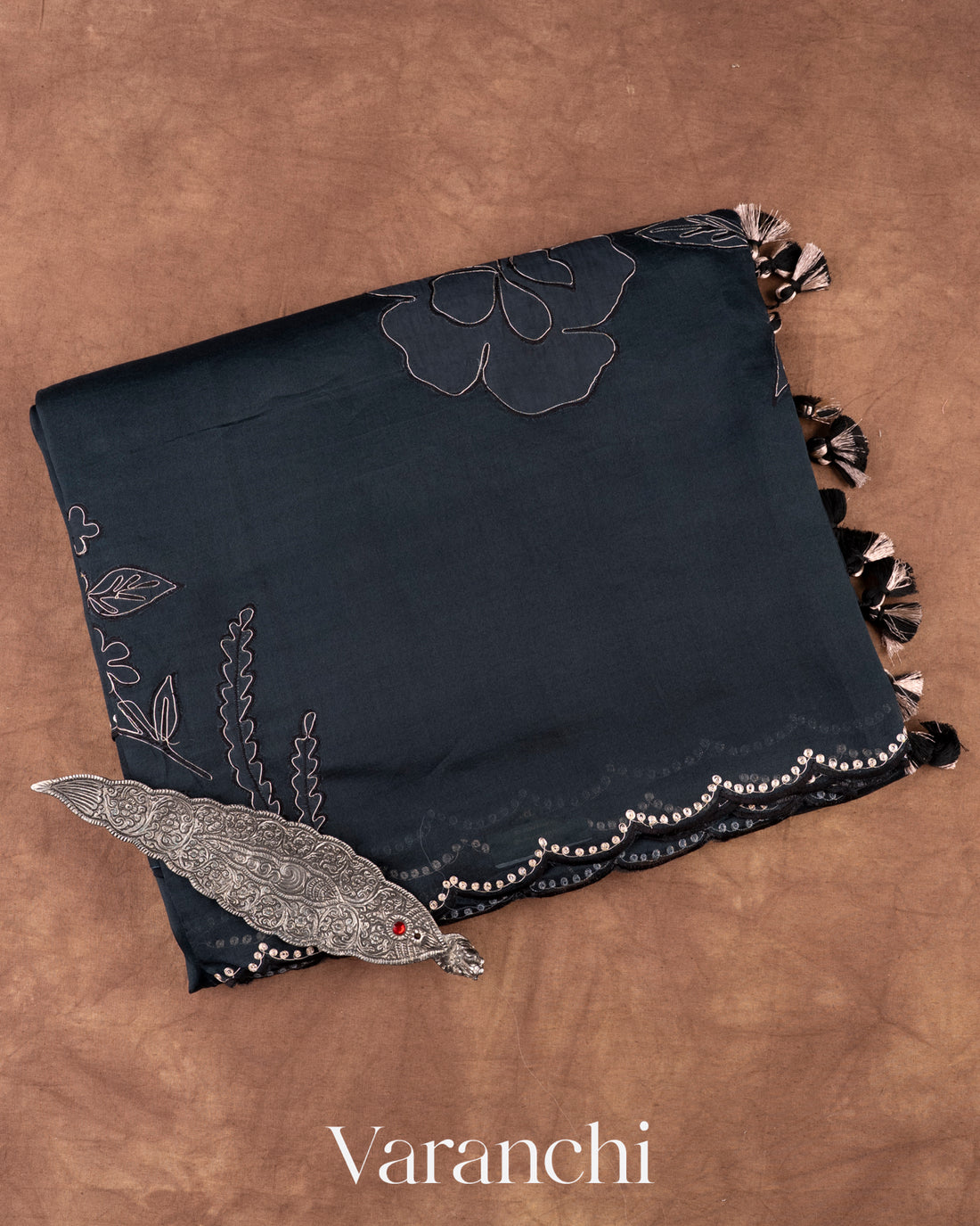 Jet Black Floral Applique Pure Kora Silk Saree