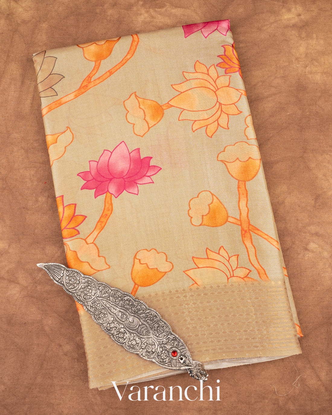 Ivory Cream Floral Printed Pure Tussar Silk Saree