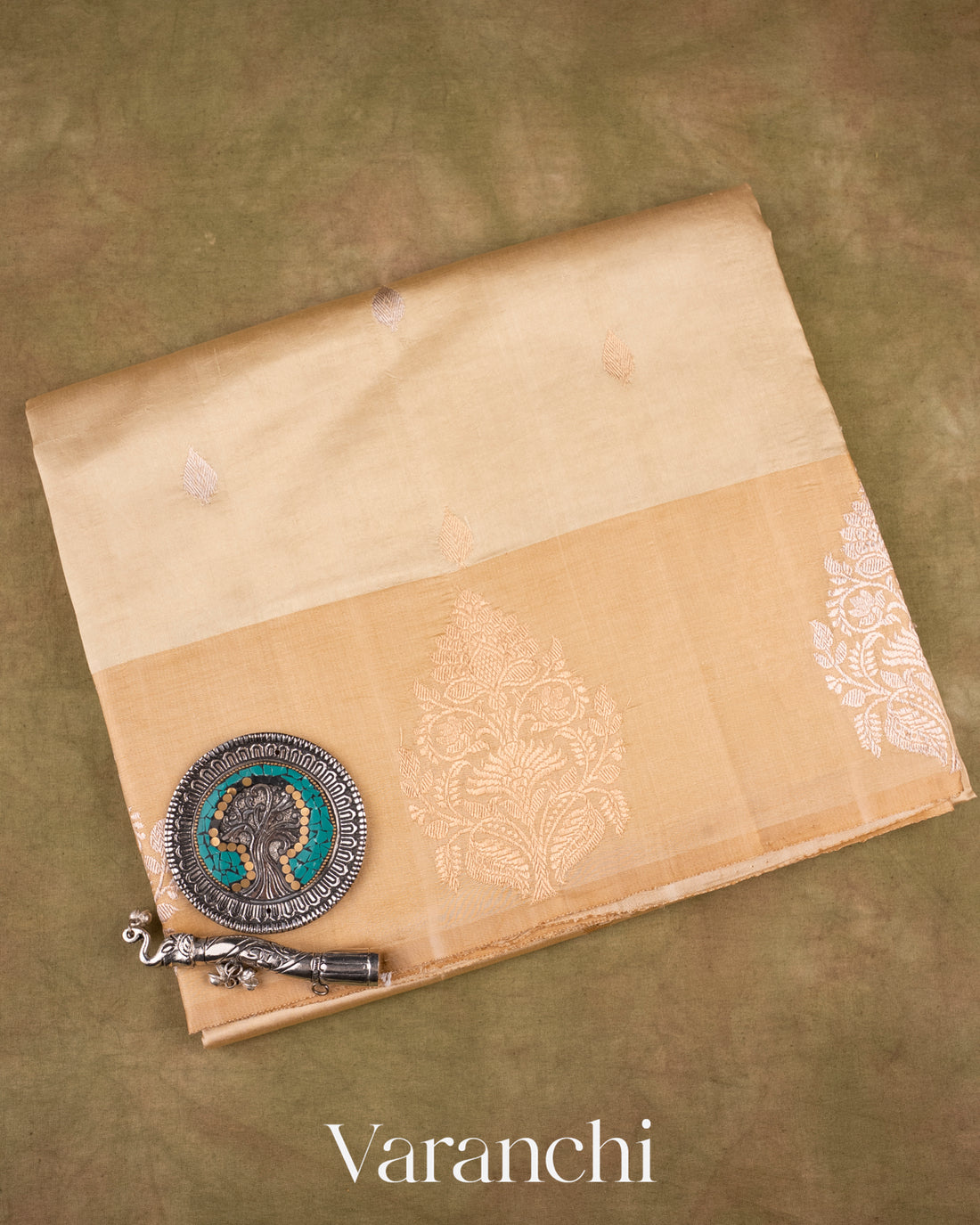 Ivory and Olive Green Hand Painted Design Pure Silk Linen Saree