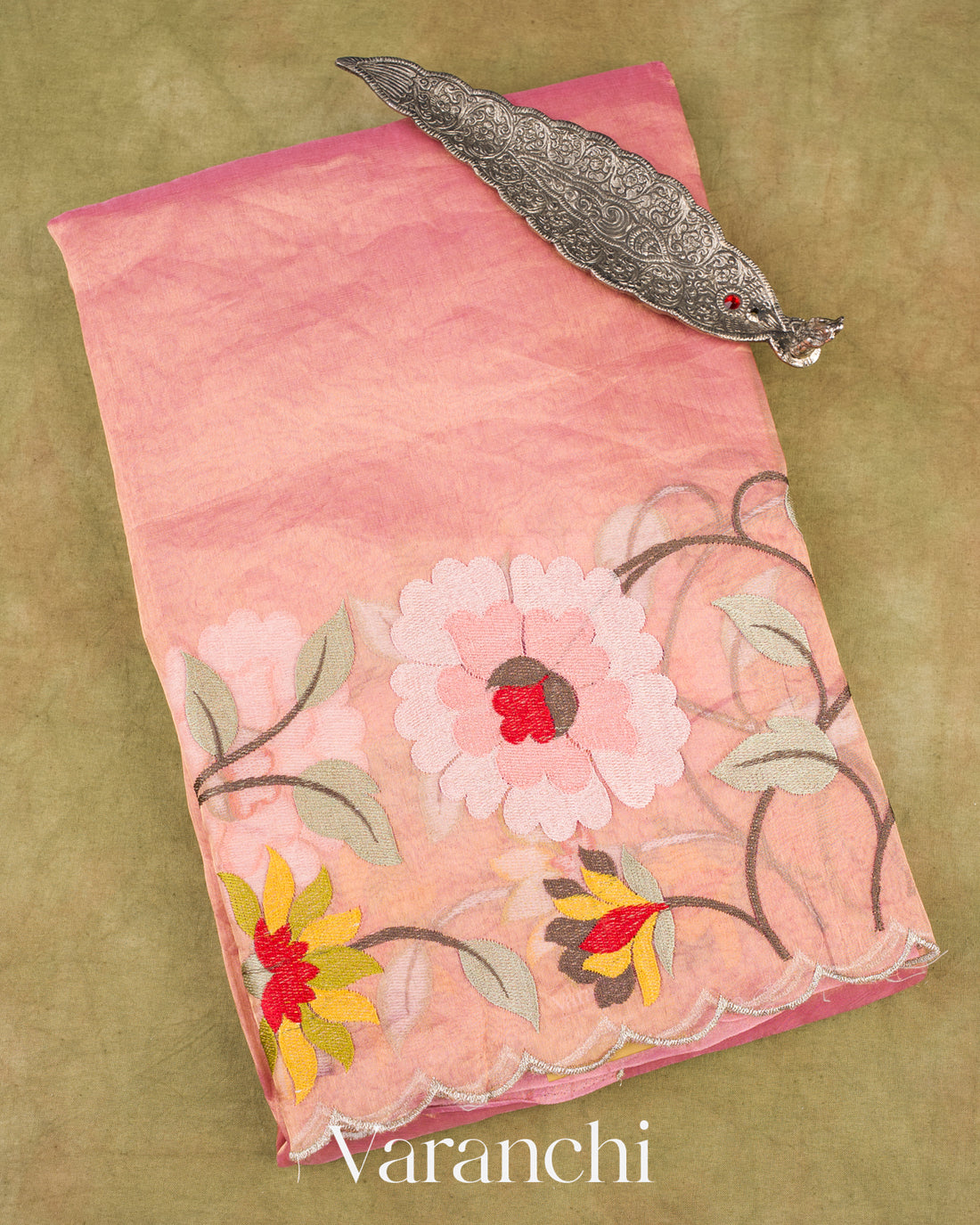 Light Pink Floral Embroidered Pure Tissue Kora Silk Saree