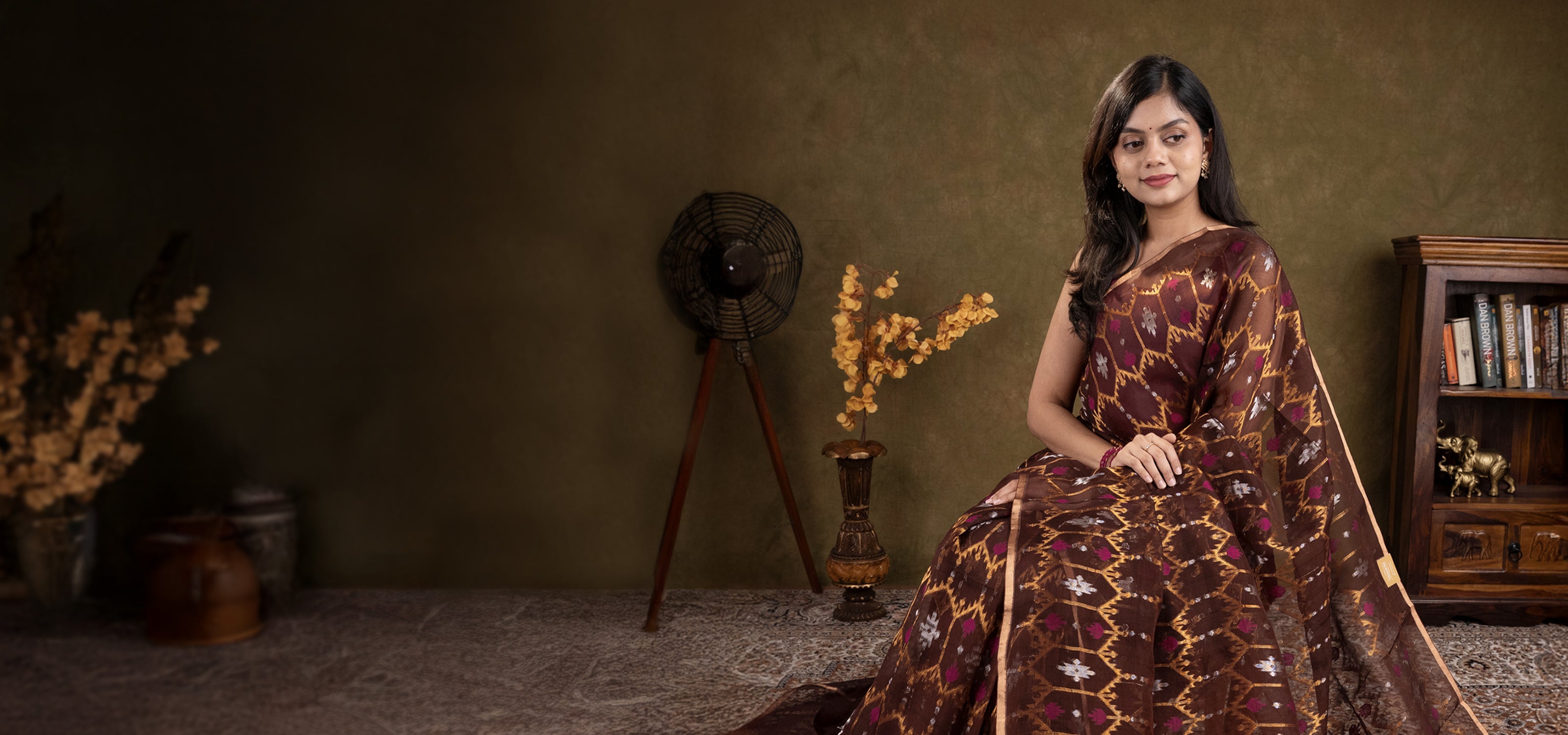 Originating from Dhaka and later flourishing in Bengal, Jamdani is a labor-intensive weaving technique where motifs are painstakingly hand-inserted into the fabric on a traditional loom. Woven with the finest silk threads, Jamdani sarees are known for their sheer texture, lightweight drape, and intricate patterns—often inspired by nature, featuring florals, paisleys, and geometric designs. Each saree can take weeks or even months to complete, making it not just a garment but a piece of living heritage.