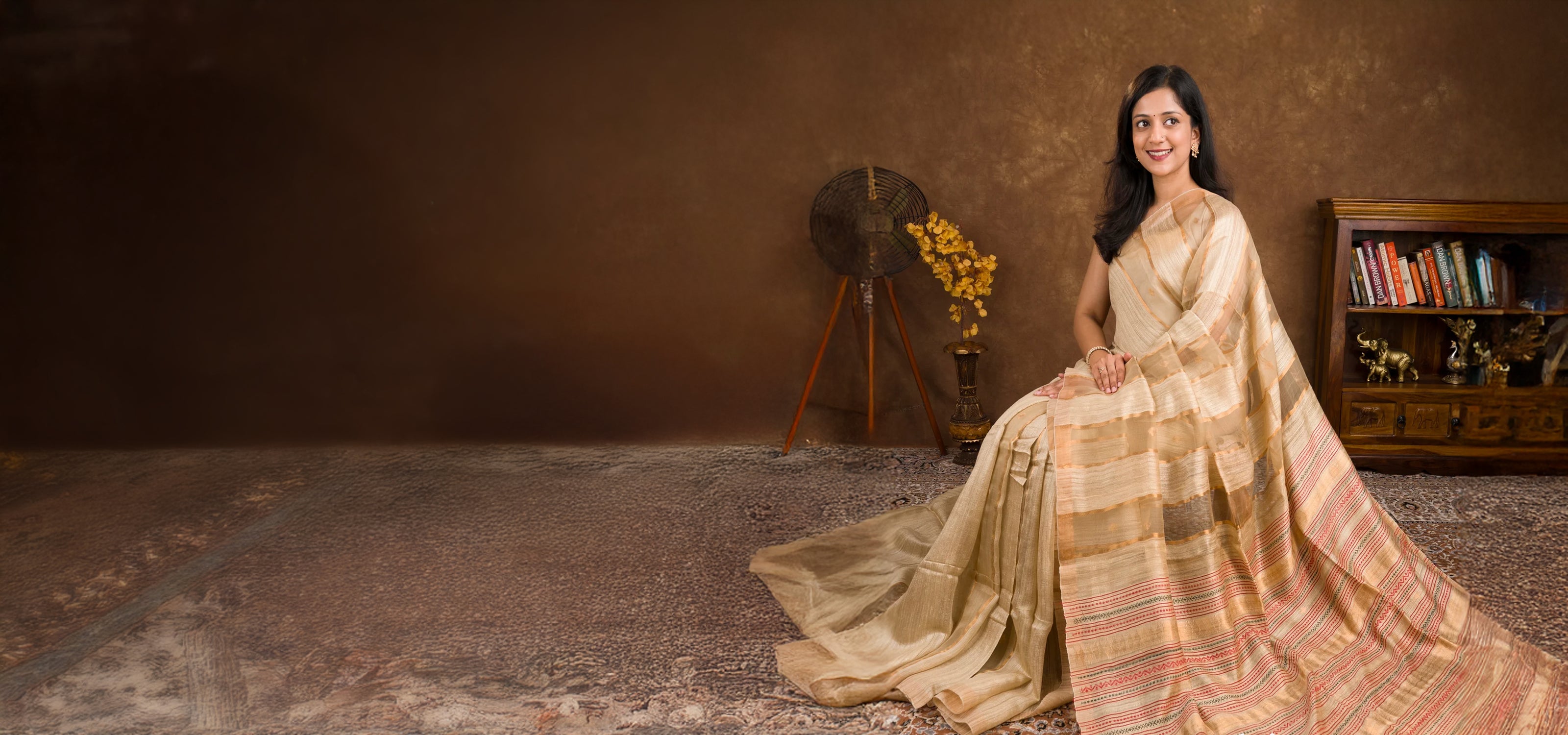Beige with Muslin Stripes With Pure Matka Silk Handloom Saree