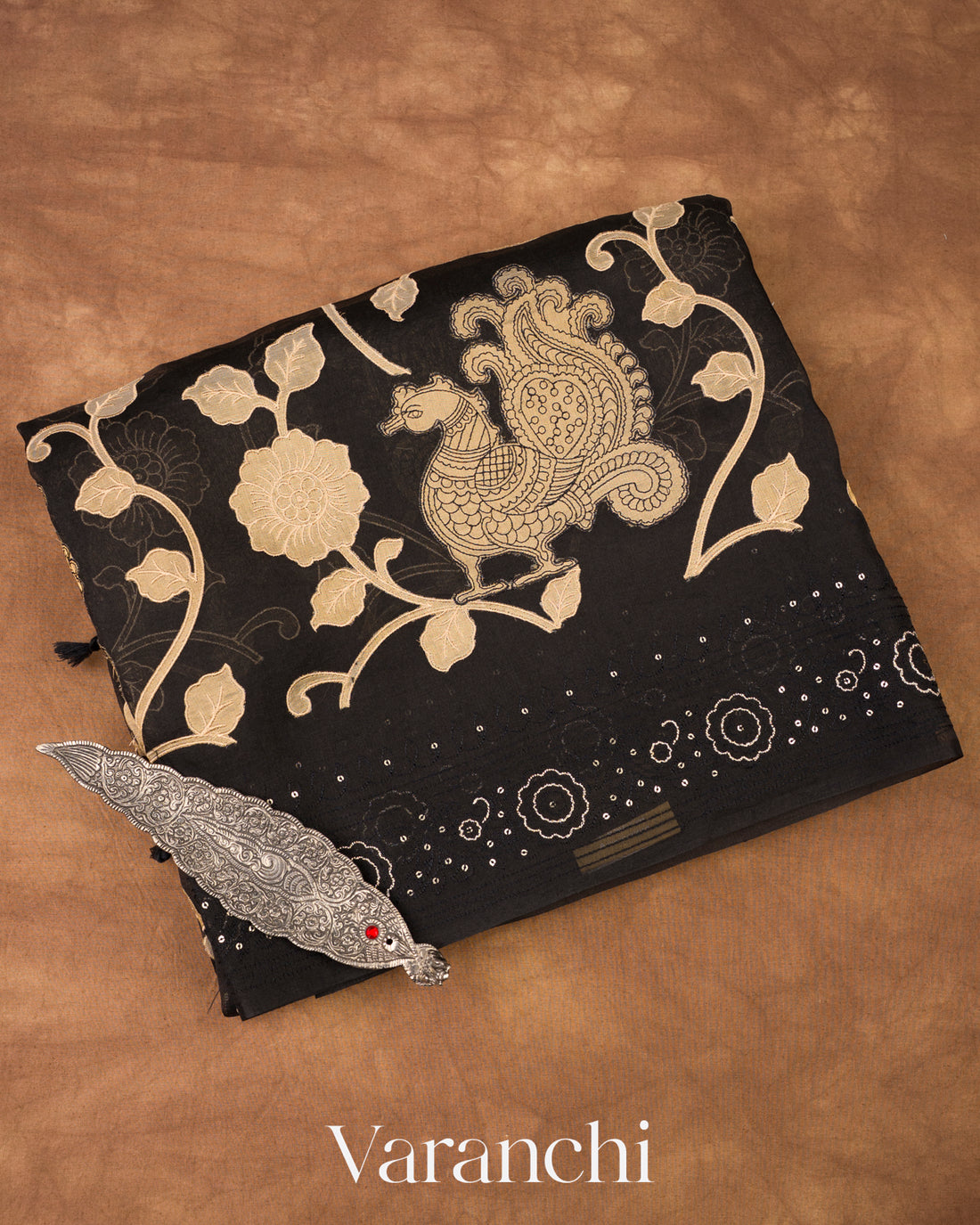 Black Peacock Applique and Embroidered Pure Kora Silk Saree