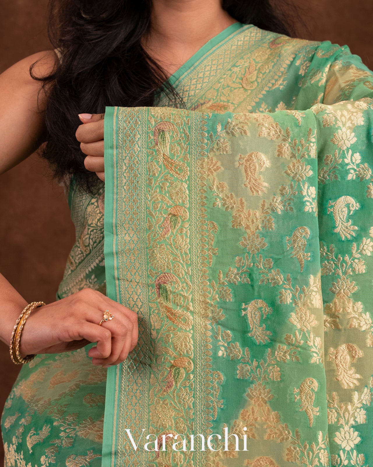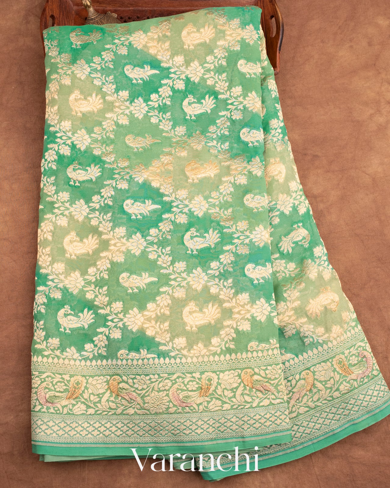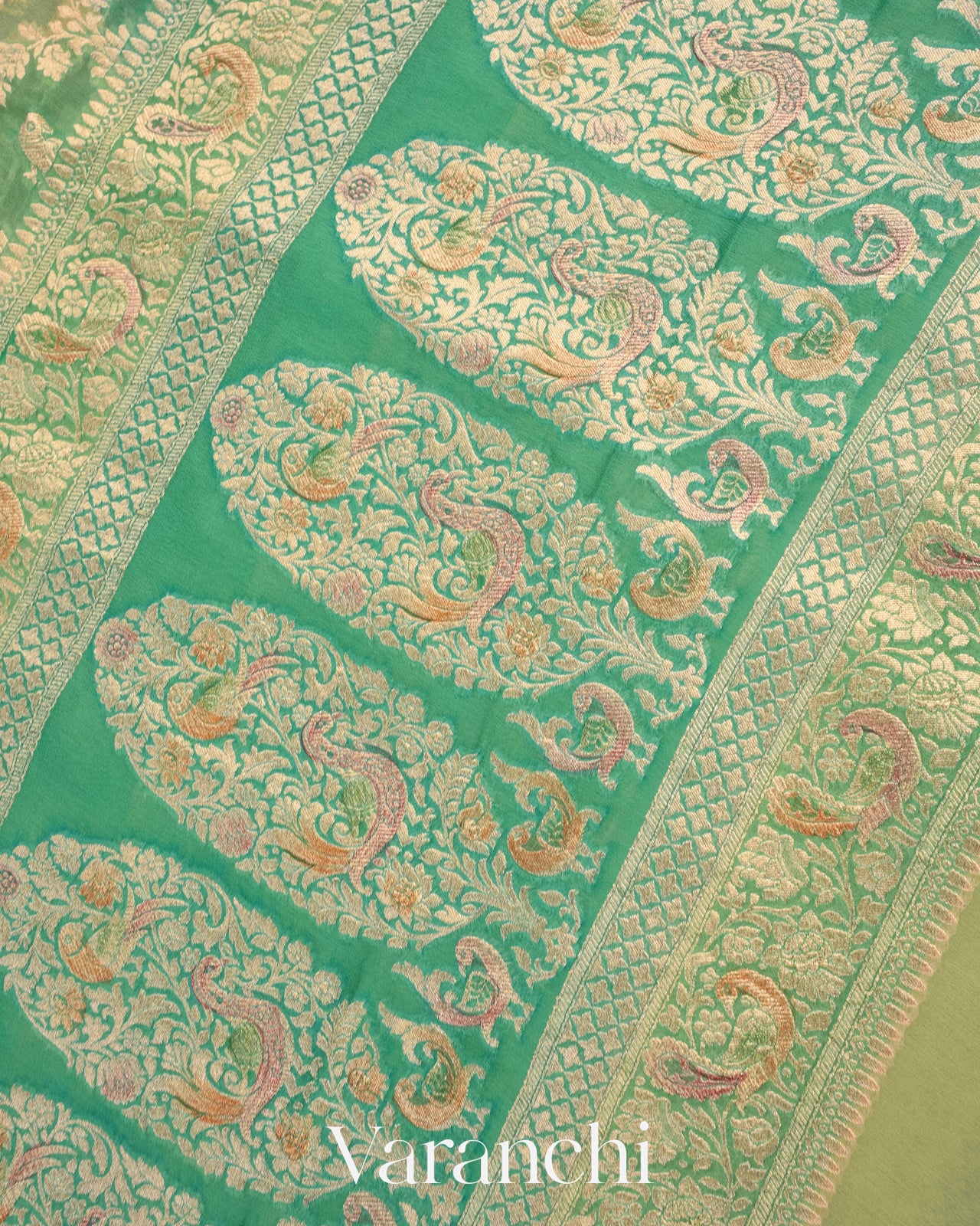 Aqua Green Rangkaat Pure Khaddi Georgette Silk Handloom Saree