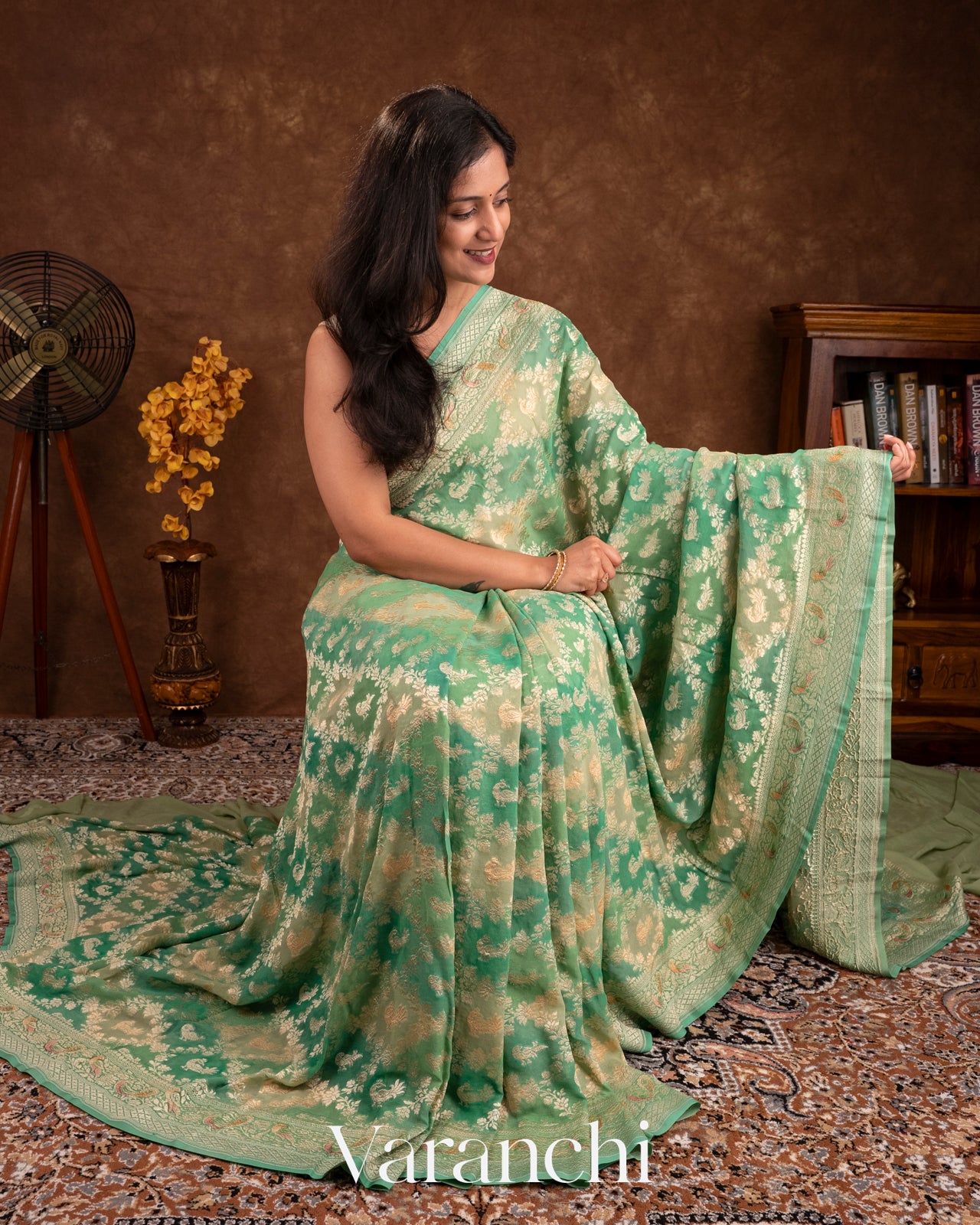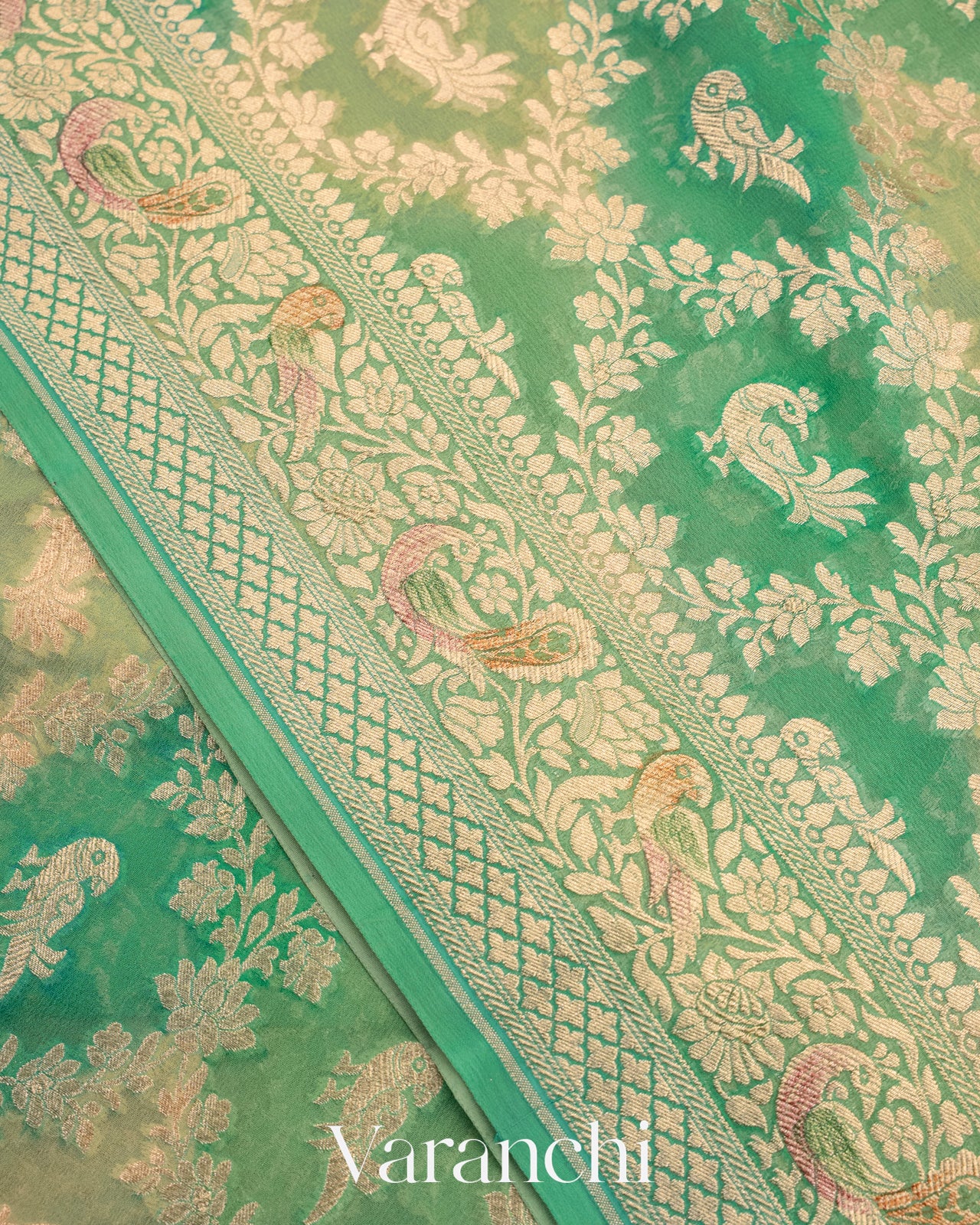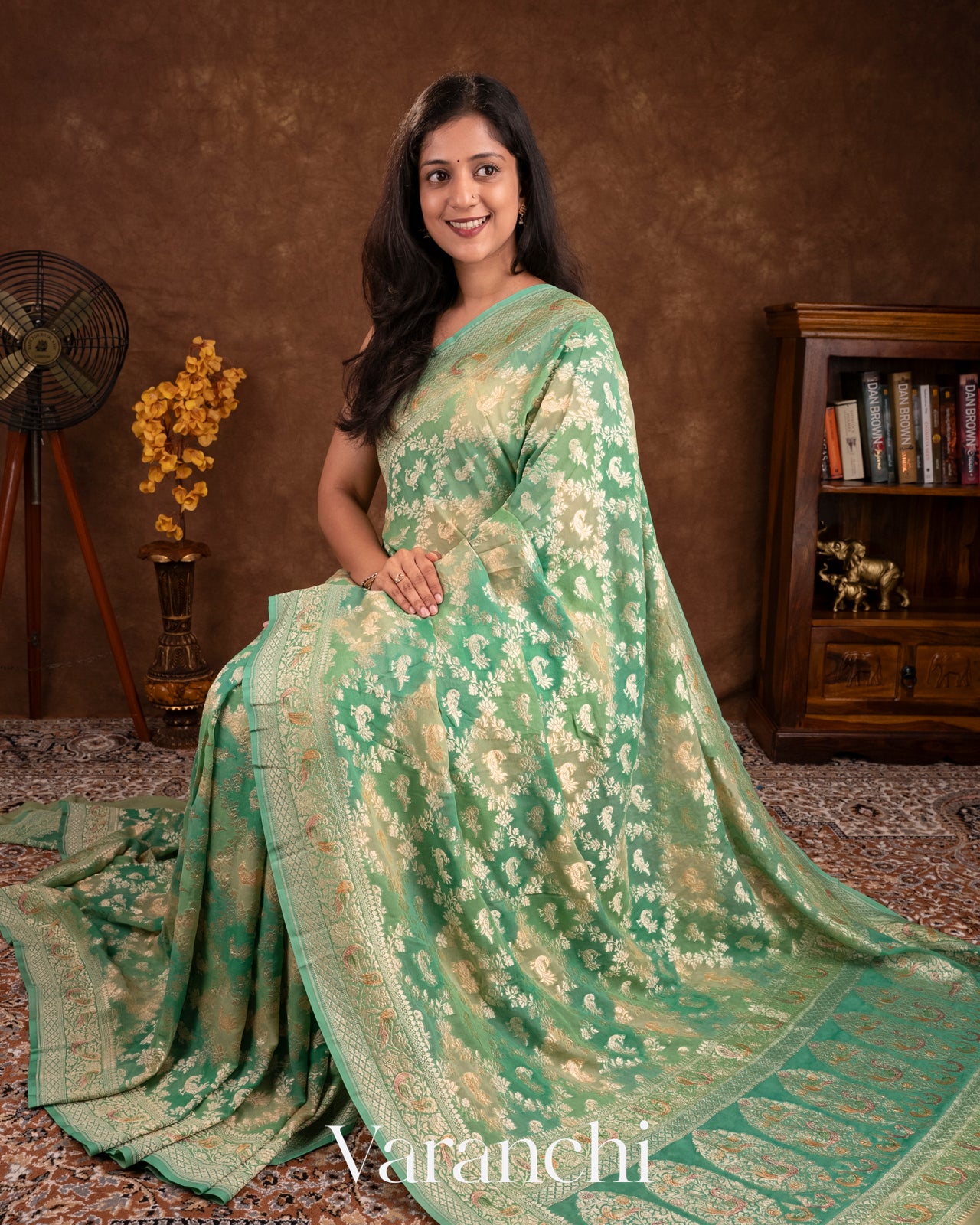 Aqua Green Rangkaat Pure Khaddi Georgette Silk Handloom Saree
