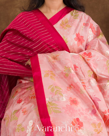 Baby Pink Floral Printed Pure Raw Mango Silk Handloom Saree
