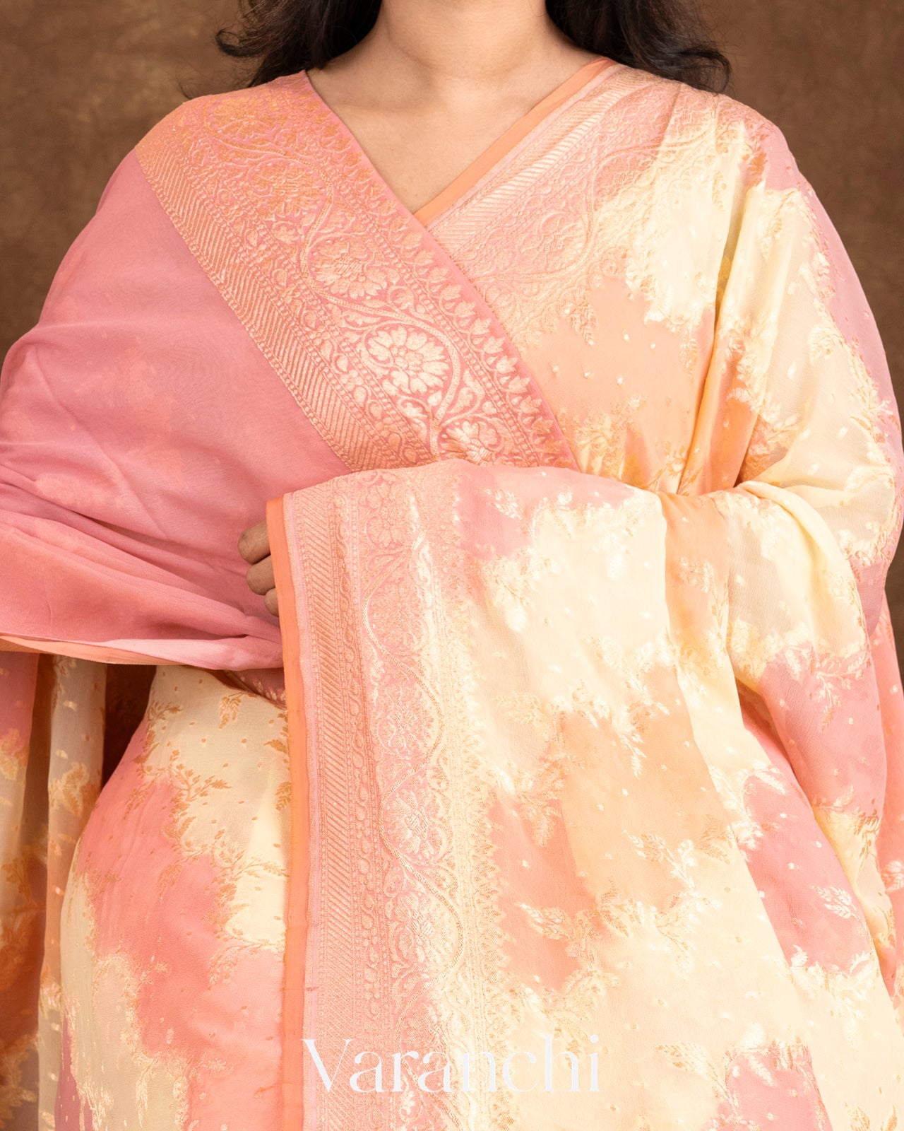 Baby Pink Tricolour Pure Khaddi Georgette Silk Handloom Saree