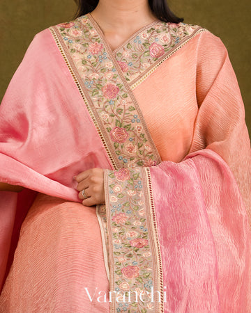 Blush Pink and Peach Ombre-Dyed Pure Crush Tissue Kora Silk Saree