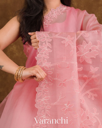 Blush Pink Floral Applique Pure Kora Silk Saree