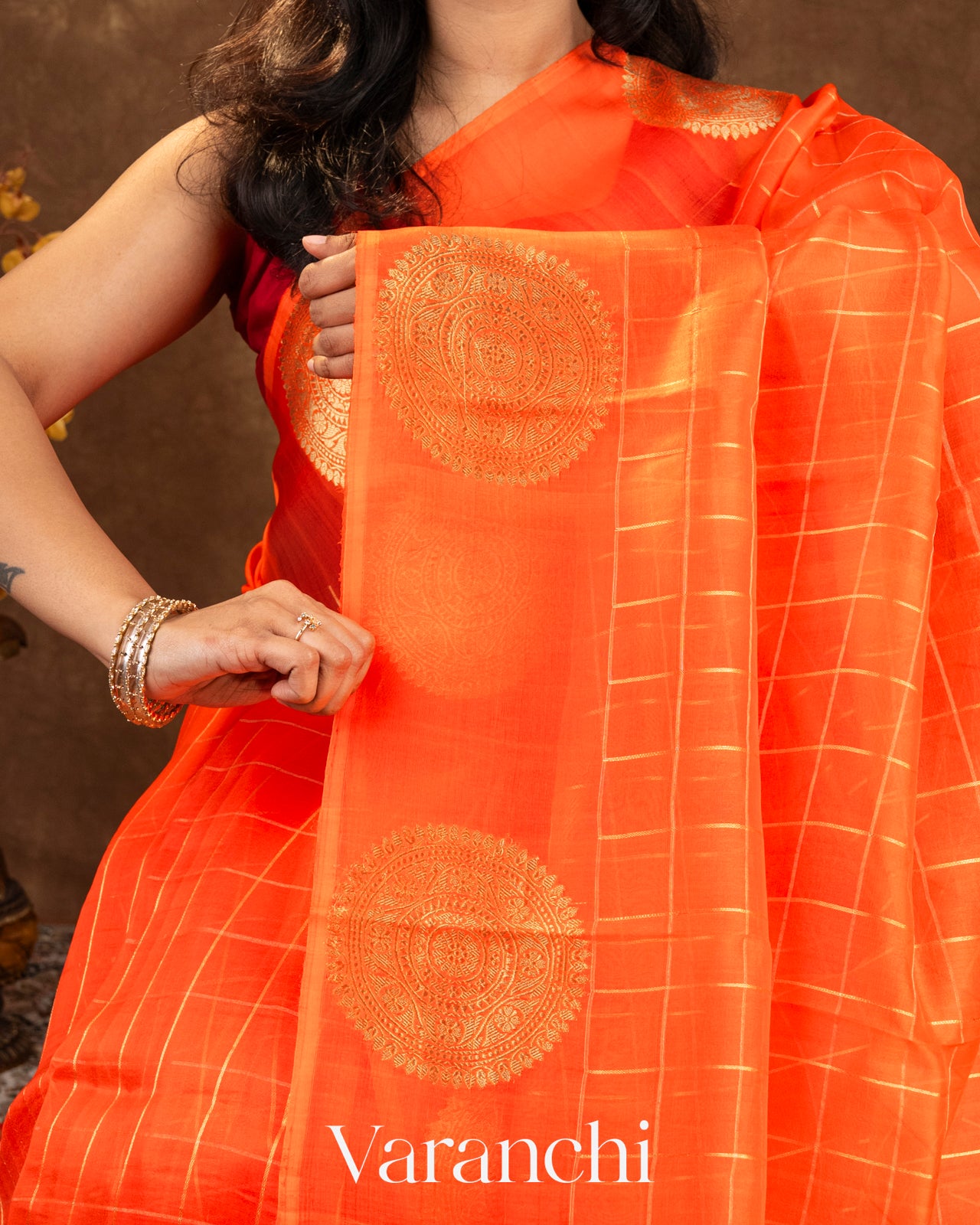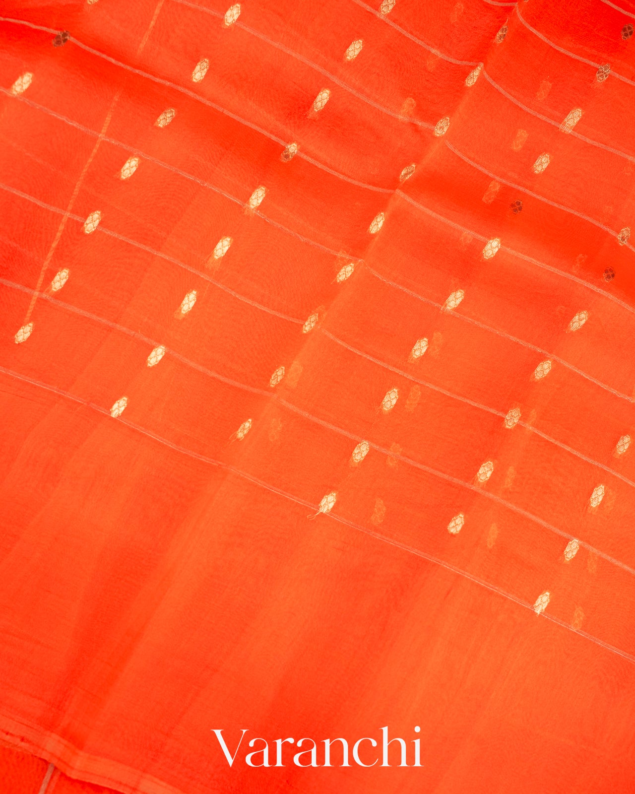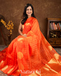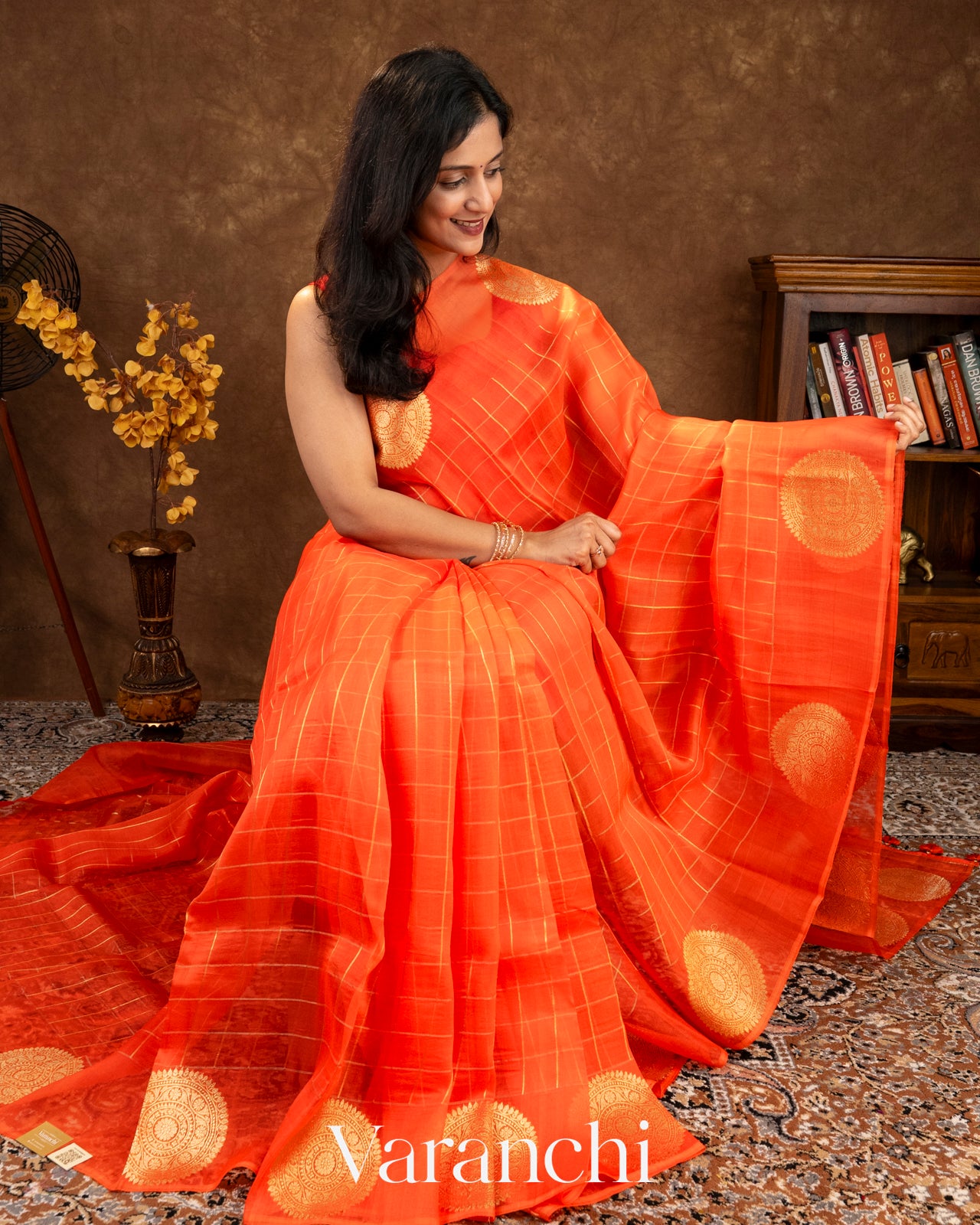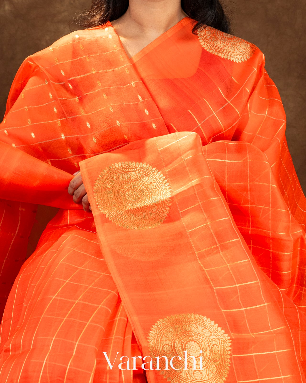 Bright Orange Checks Pure Kora Silk Handloom Saree