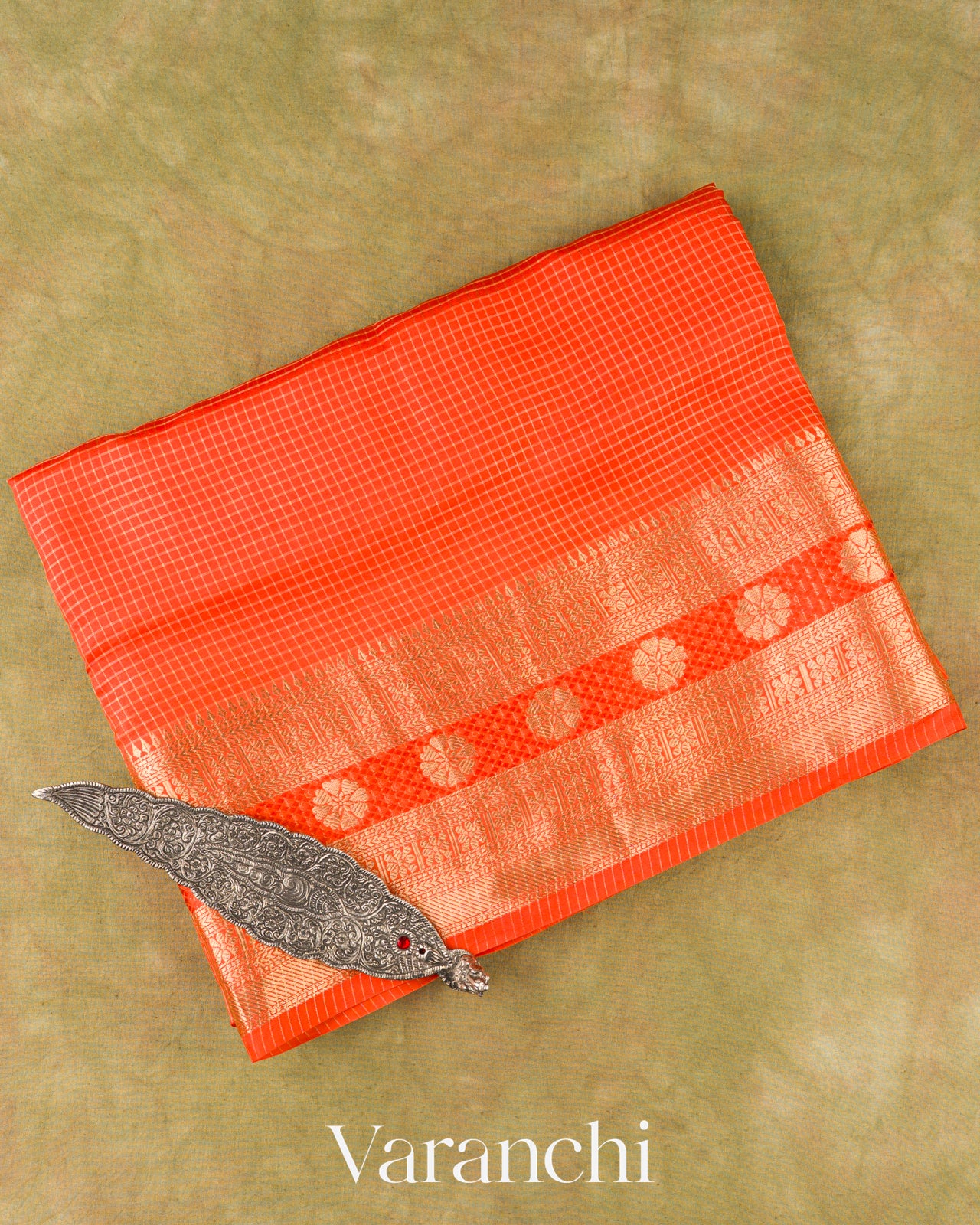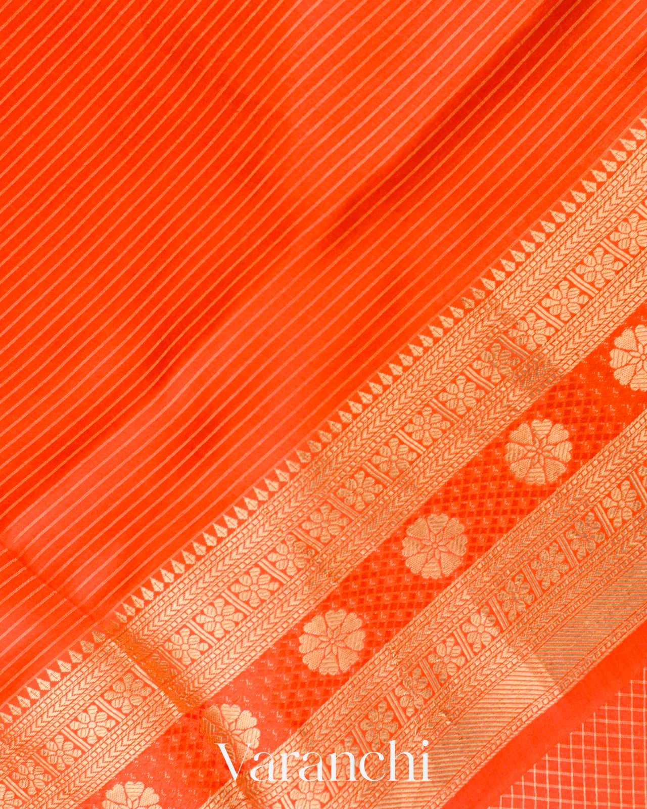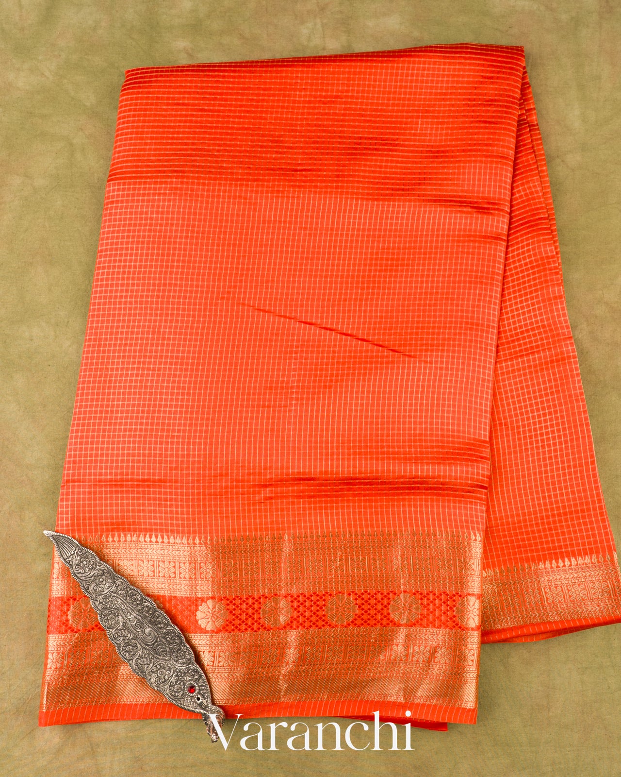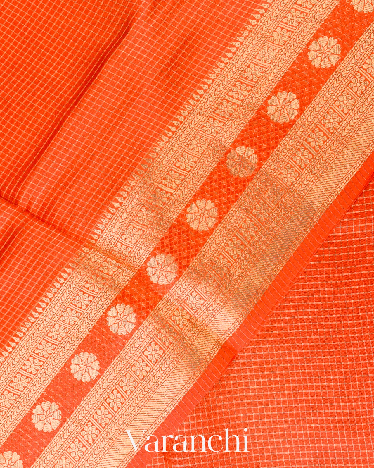 Bright Orange Checks Pure Poona Silk Saree