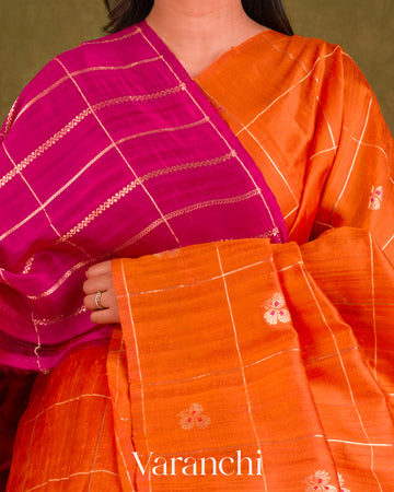 Bright Orange Checks Pure Raw Silk Handloom Saree