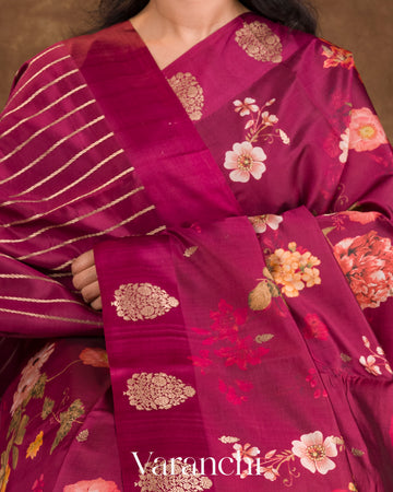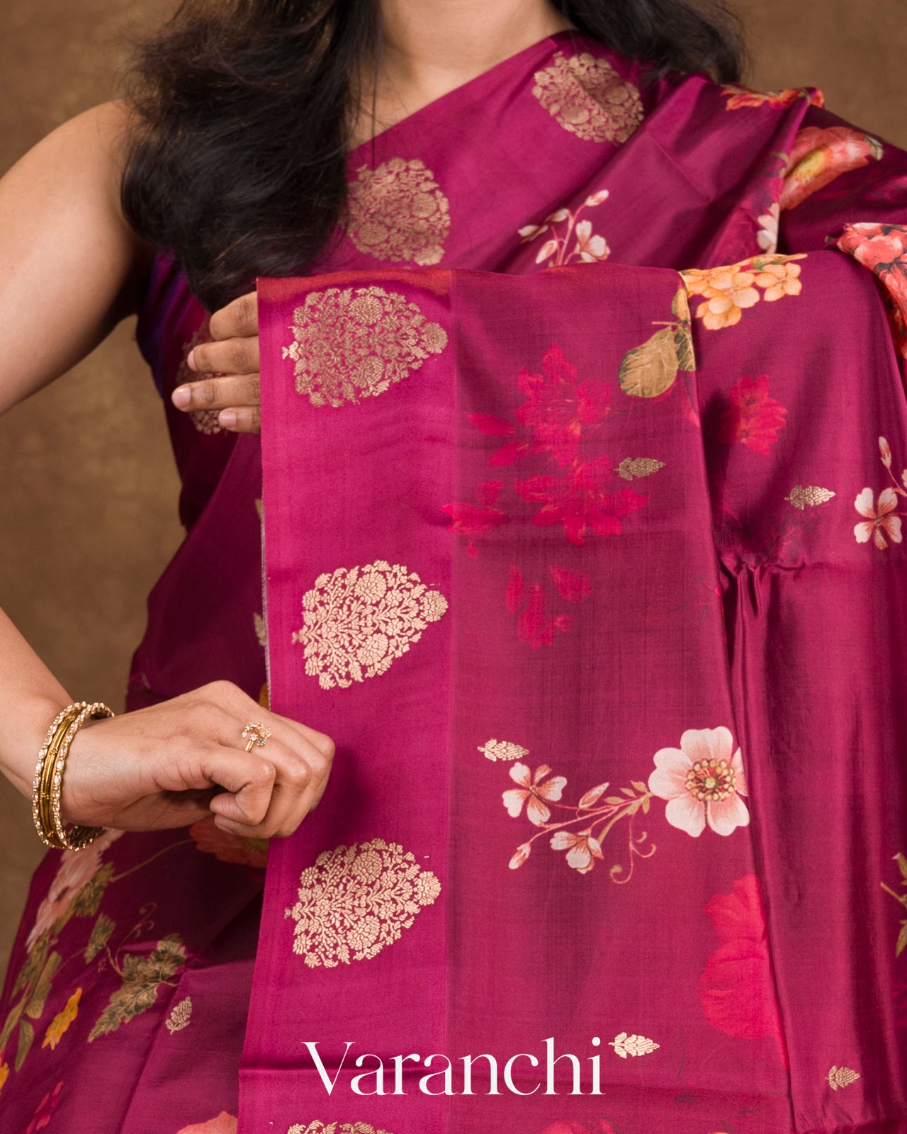 Burgundy Floral Printed Pure Raw Mango Silk Handloom Saree