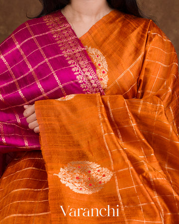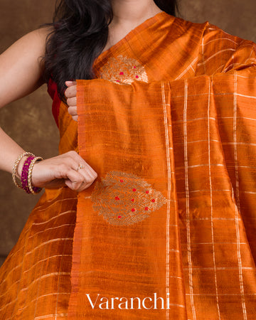 Burnt Orange Checks Pure Raw Silk Handloom Saree
