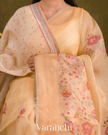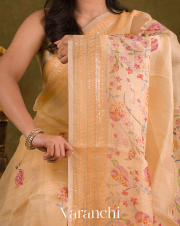 Butter Yellow Embroidered and Digital Printed Pure Kora Silk Saree