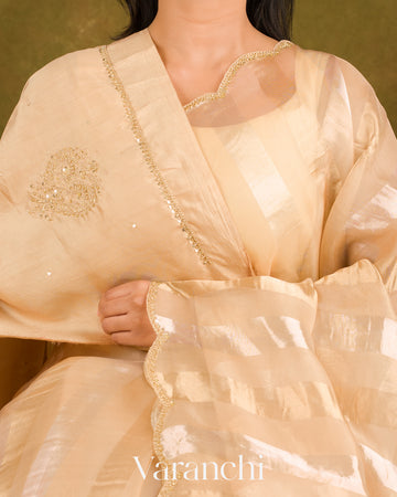 Cream Beige Tissue Striped and Embroidered Border Pure Kora Silk Saree