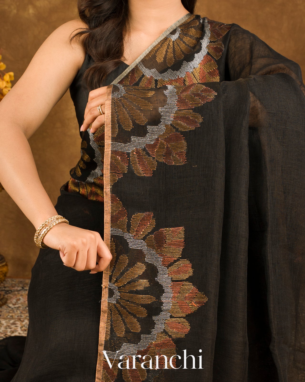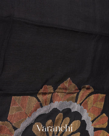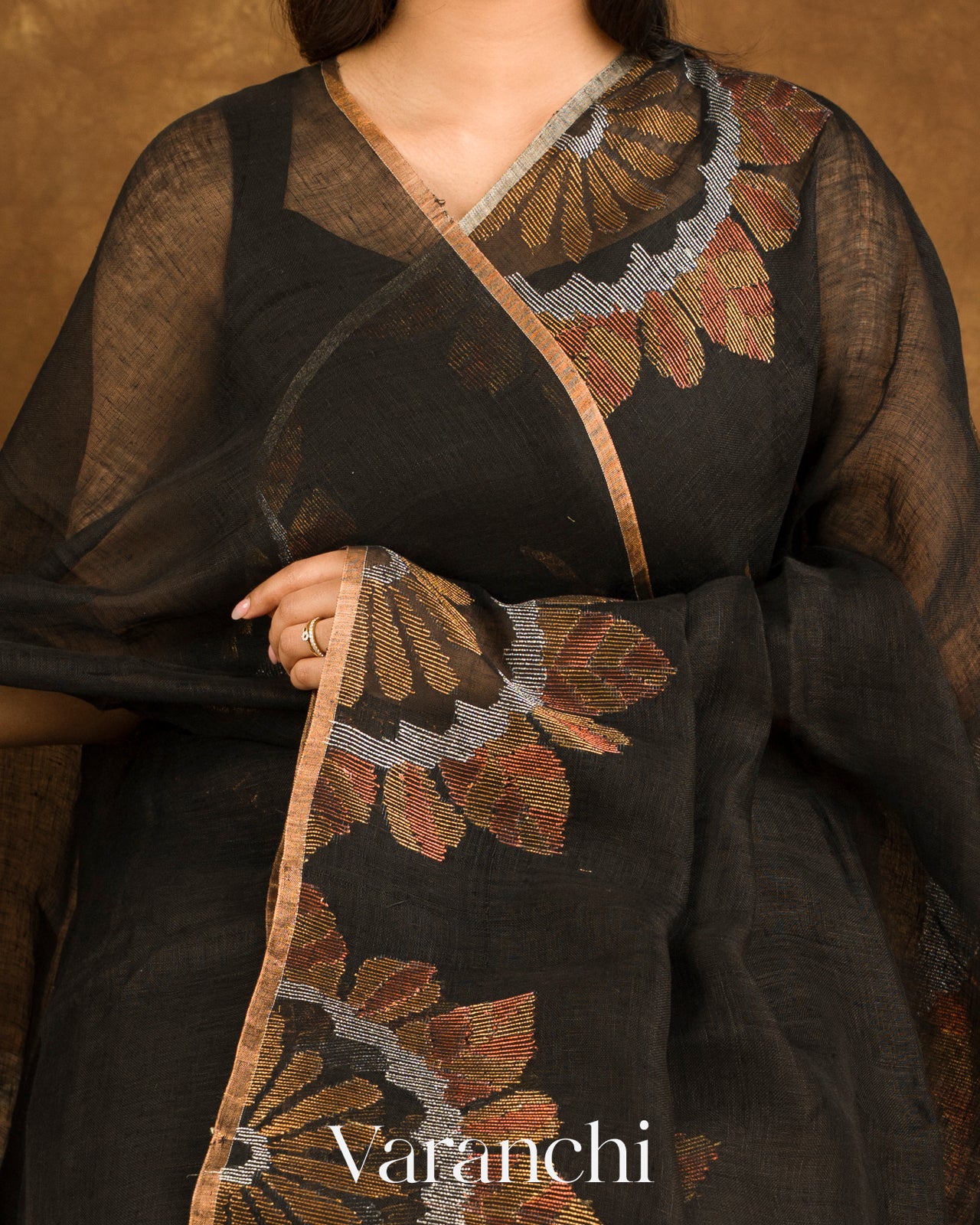 Charcoal Black Jamdani Pure Silk Linen Handloom Saree
