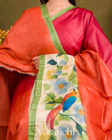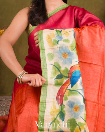 Crimson Rose Handpainted Pure Tussar Silk Saree