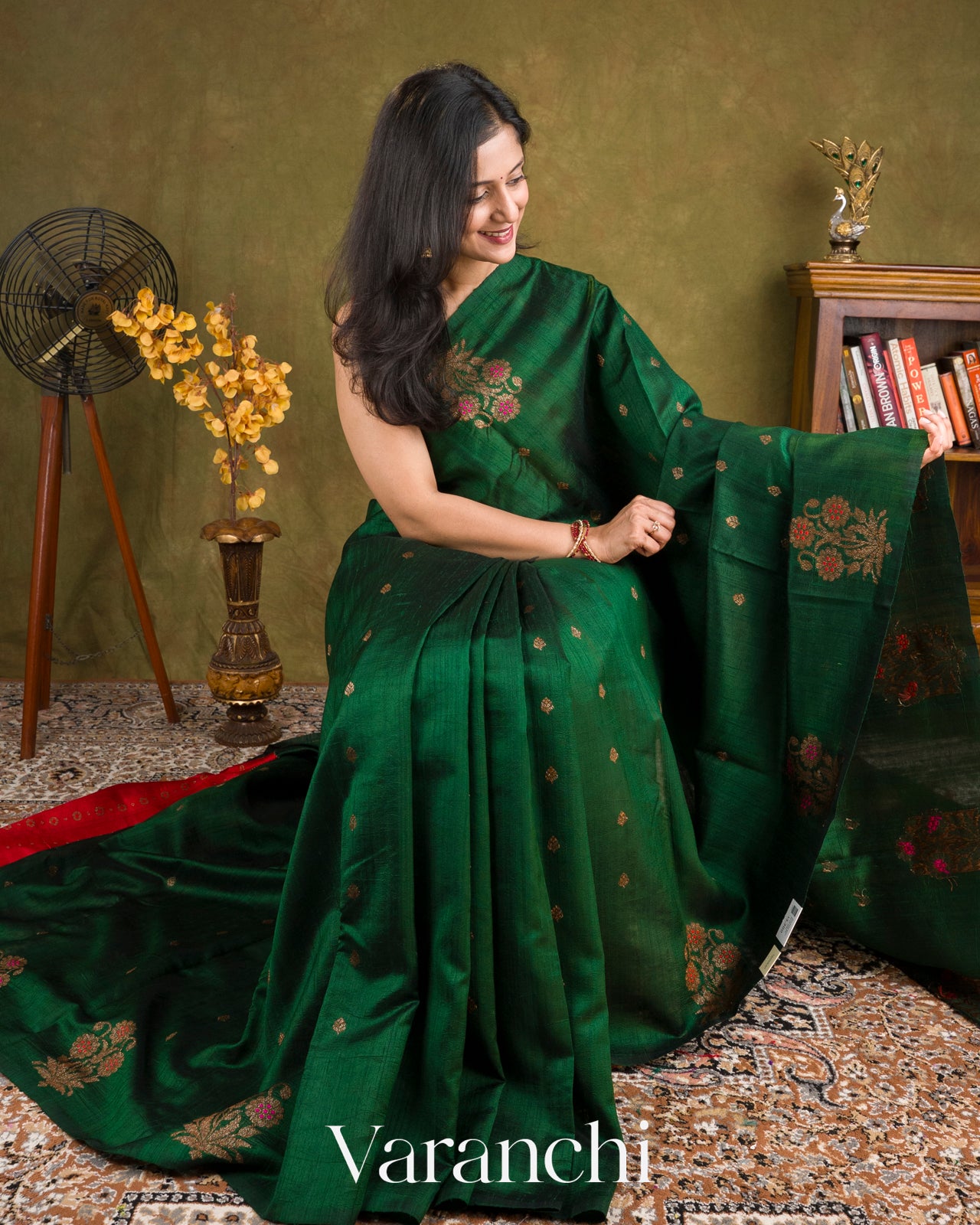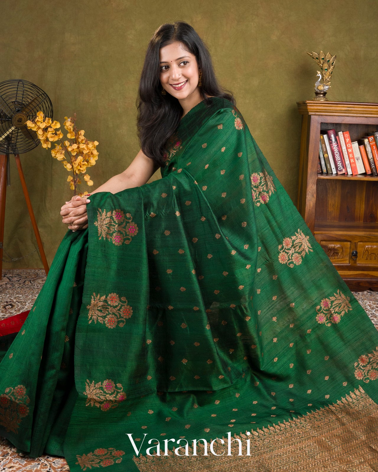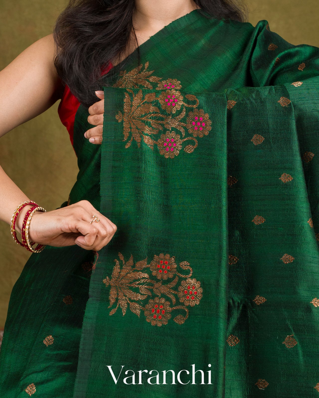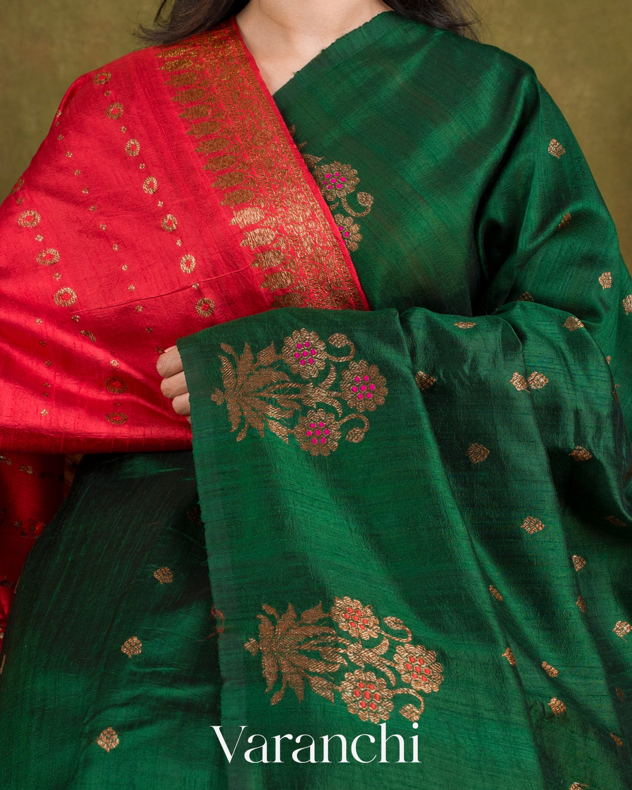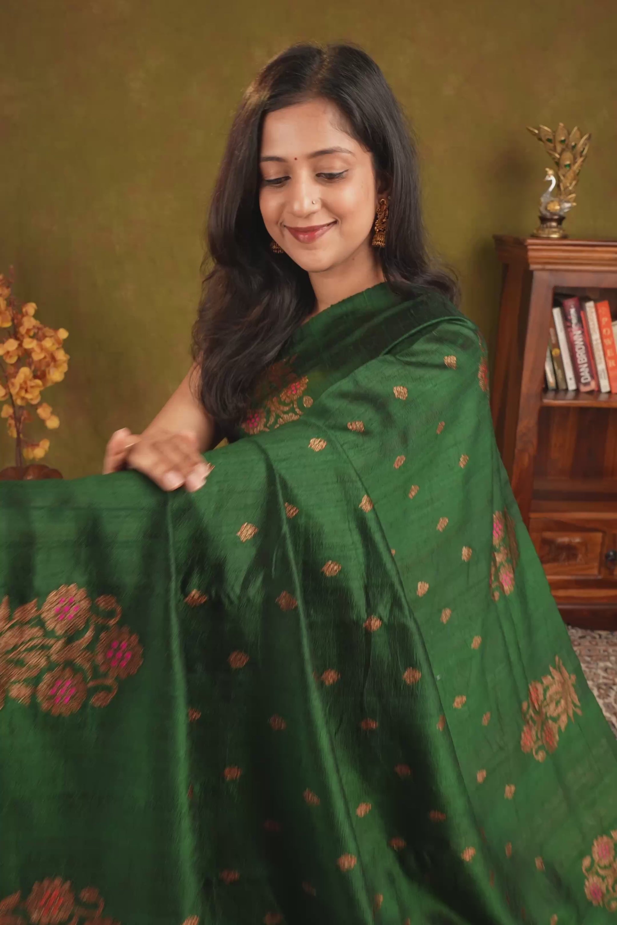 Dark Green Borderless Pure Raw Silk Handloom Saree