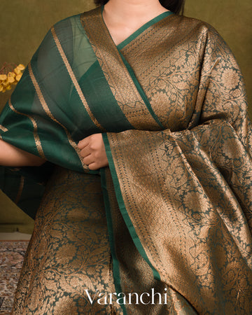 Dark Green Heavy Brocade Pure Kora Silk Handloom Saree