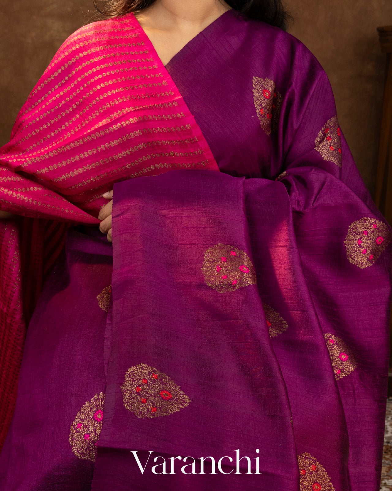 Blouse Piece Included in Rani Pink Colour With Antique Zari Stripes (1 mt. approx) |