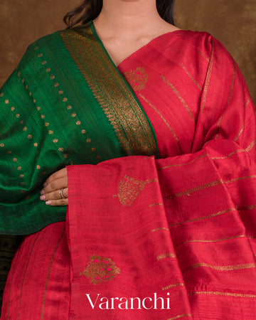 Blouse Piece Included In Emerald Green Colour With Antique Zari Butta Stripes (1 mt. approx) |