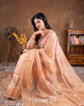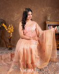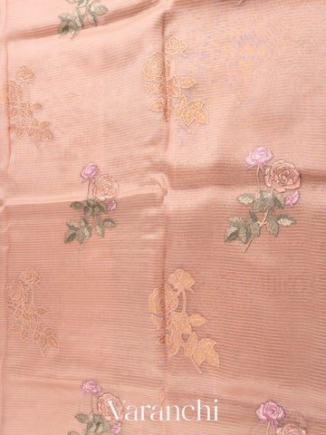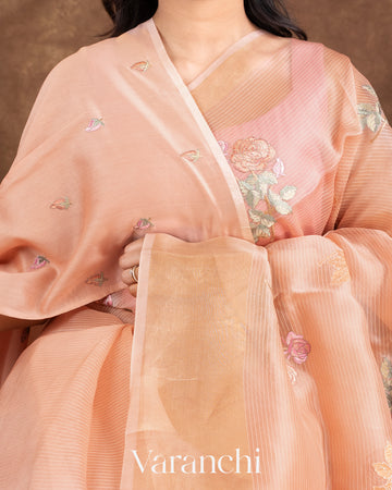 Peach Floral Applique and Embroidered Pure Kora Silk Saree