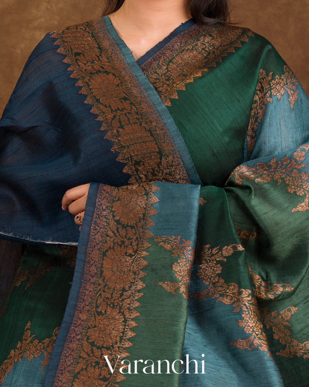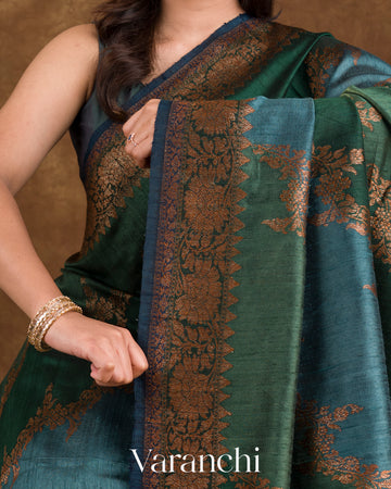 Green and Blue Tricolour Pure Raw Silk Handloom Saree