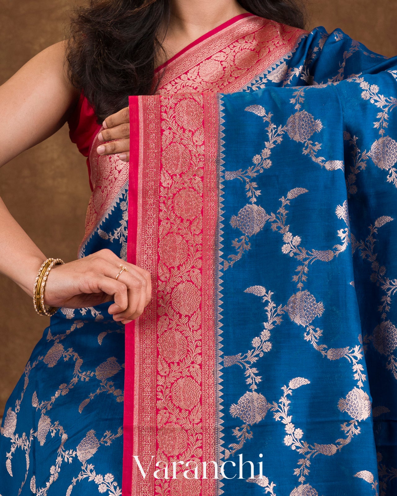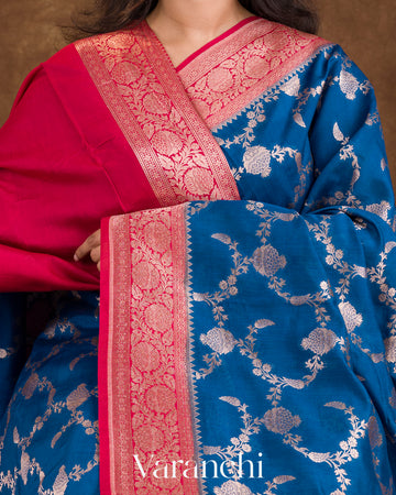 Ink Blue Floral Brocade Pure Chiniya Silk Saree