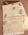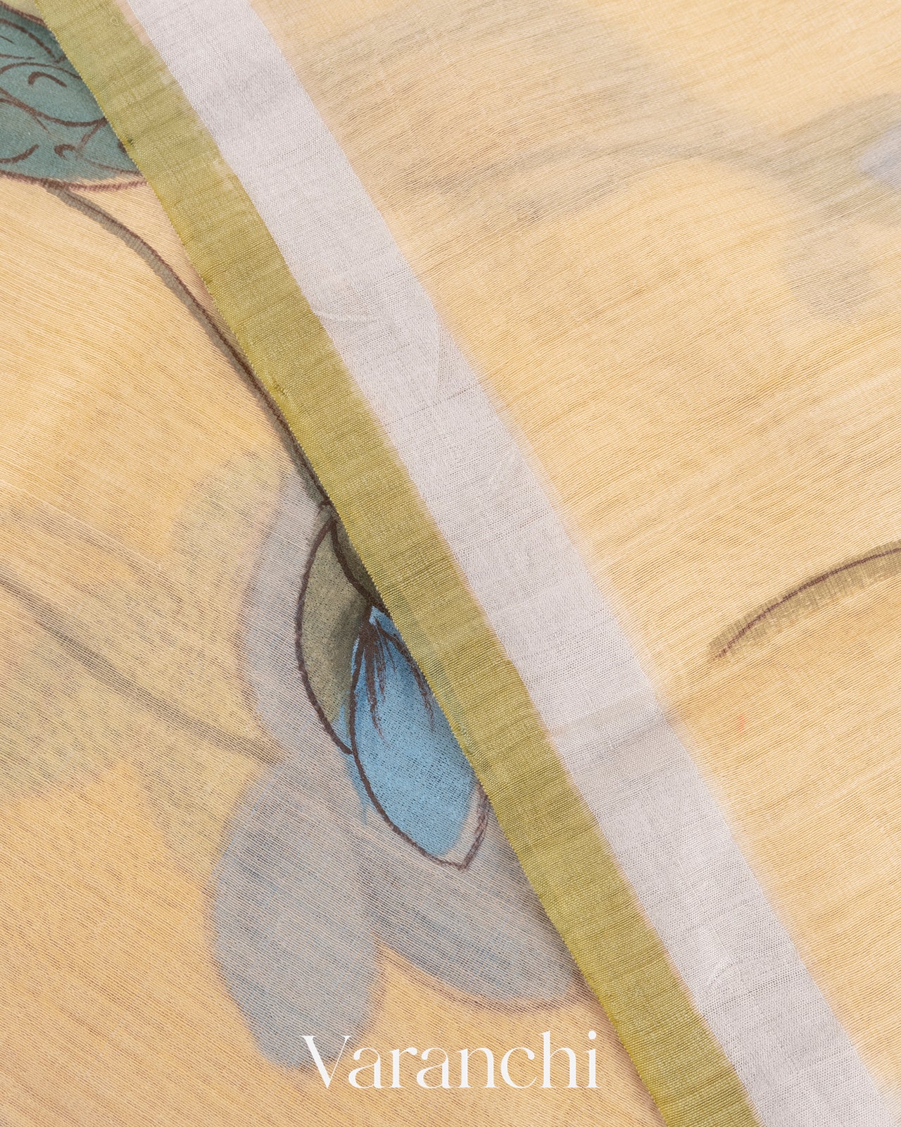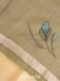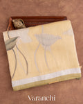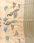 Ivory and Olive Green Hand Painted Design Pure Silk Linen Saree
