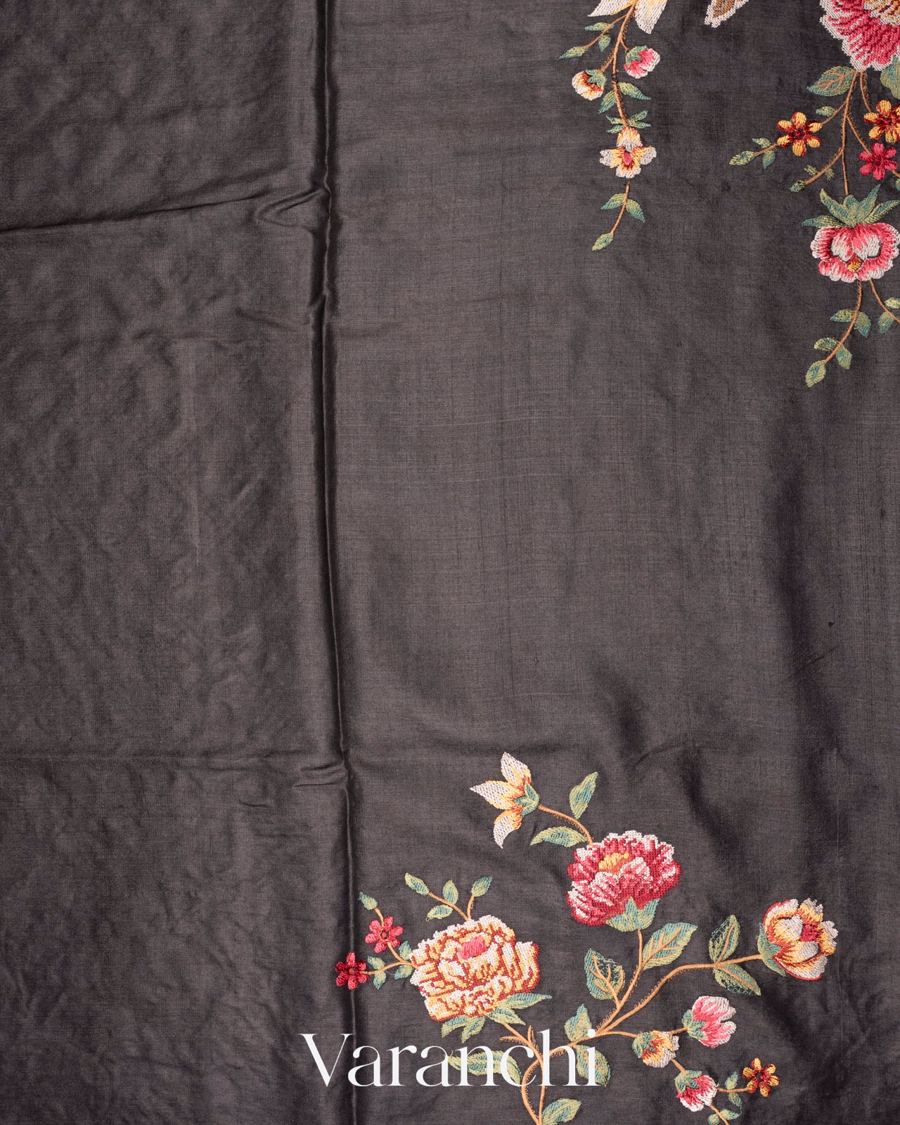 Jet Black Pure Tussar Silk with Embroidered Handloom Saree