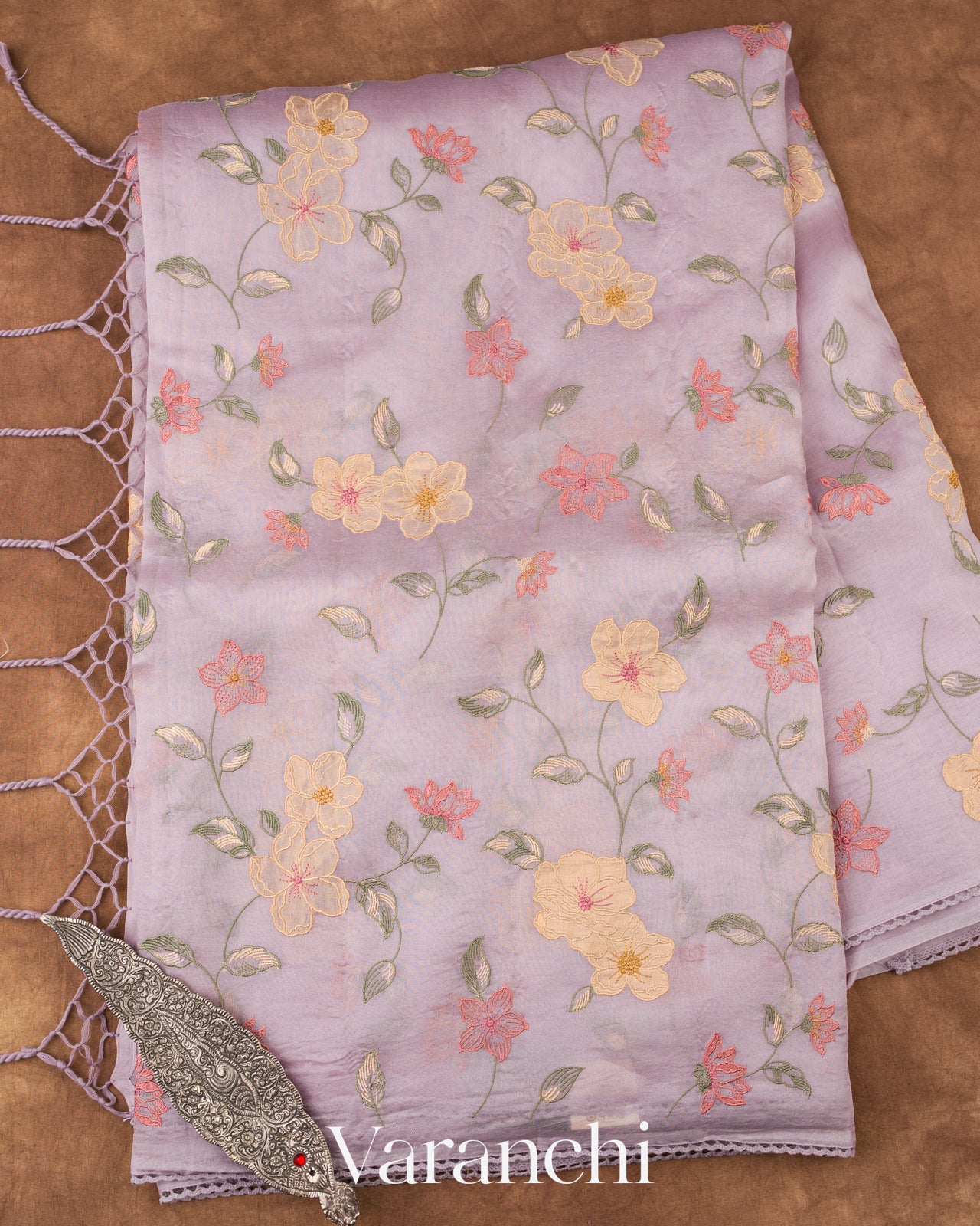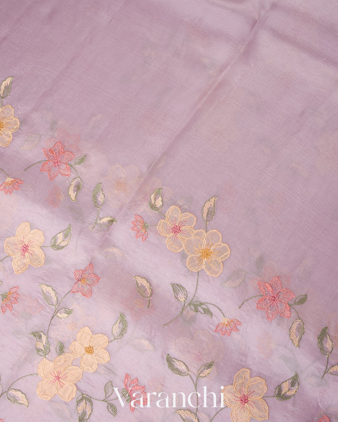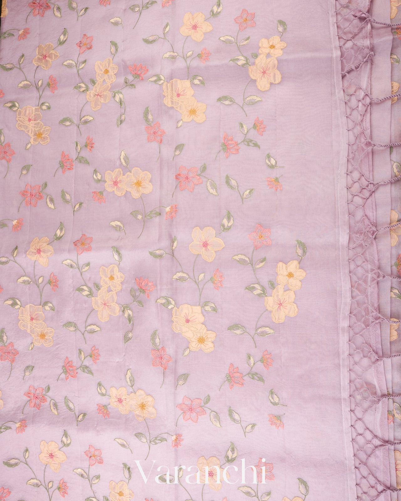 Lavender Floral Embroidered And Tissue Applique Pure Kora Silk Saree