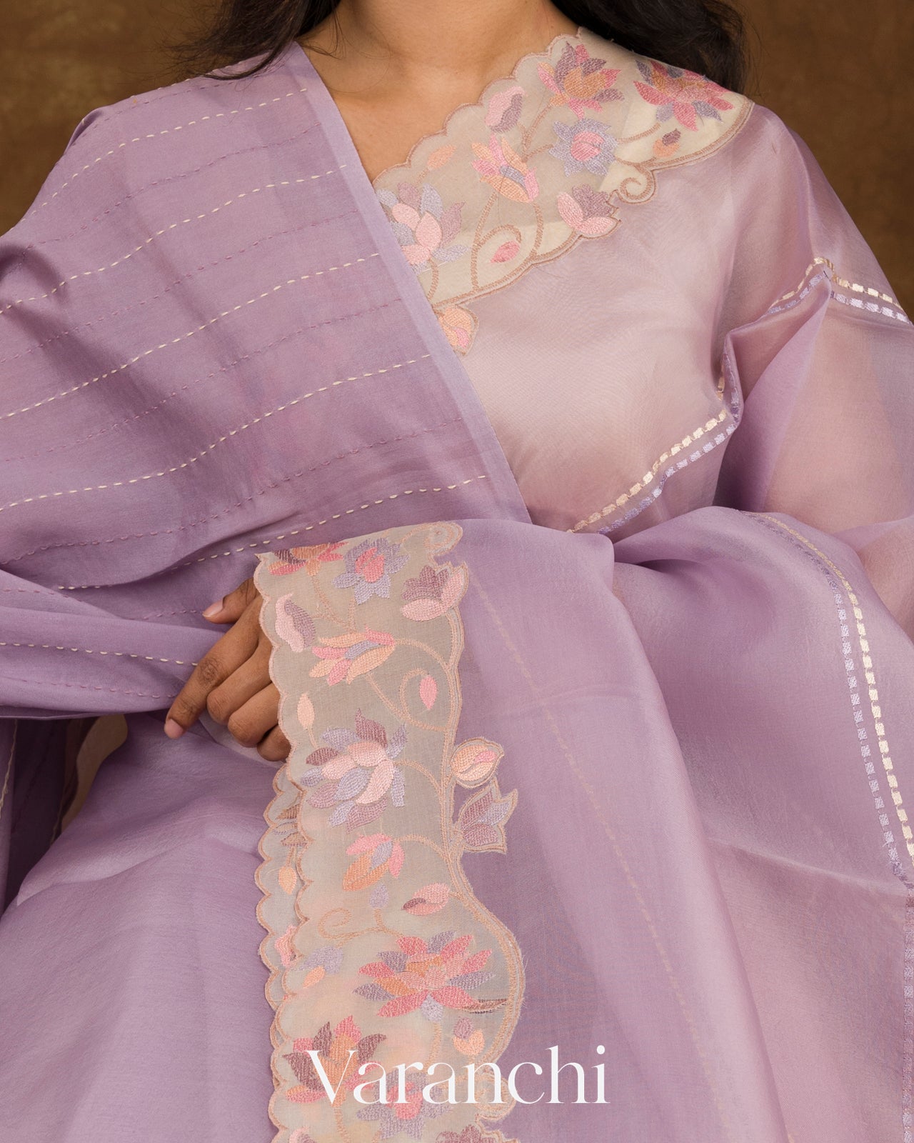 Lavender with Embroidered Border Pure Kora Silk Saree