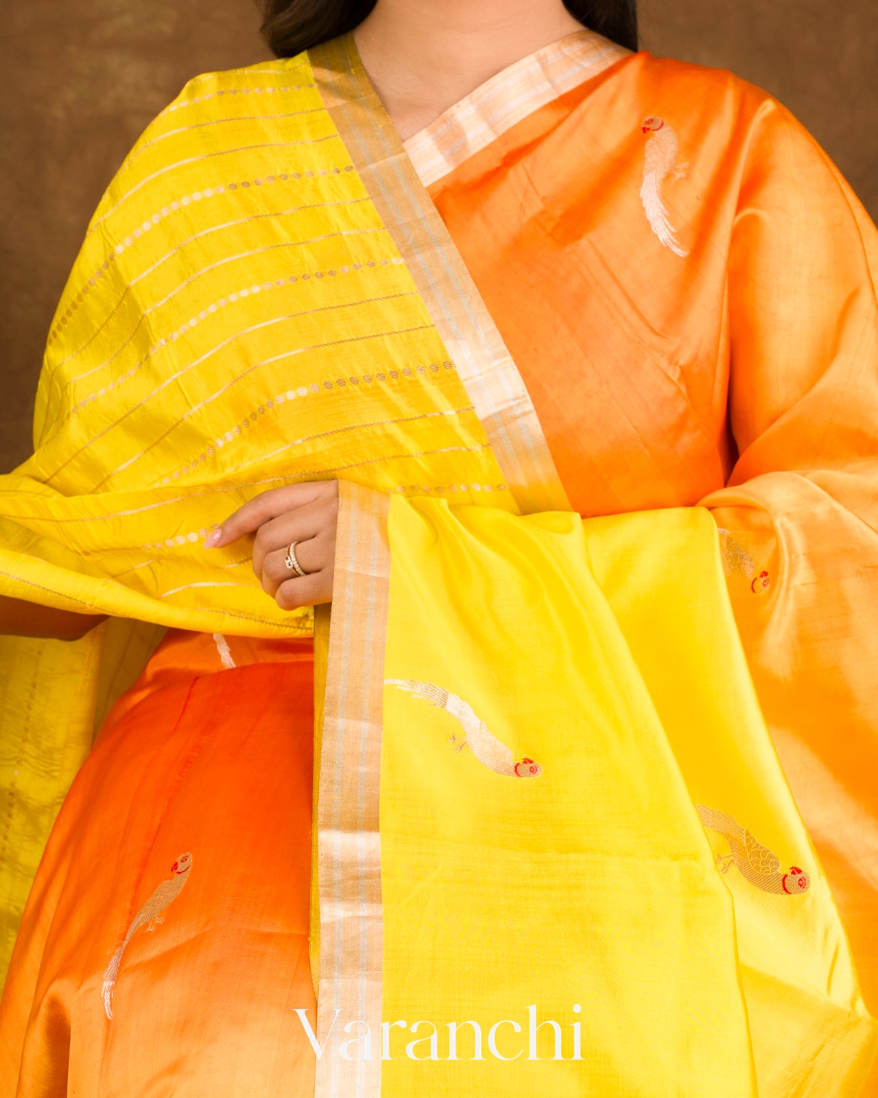 Marigold Orange And Yellow Ombre Dyed Pure Katan Silk Handloom Saree