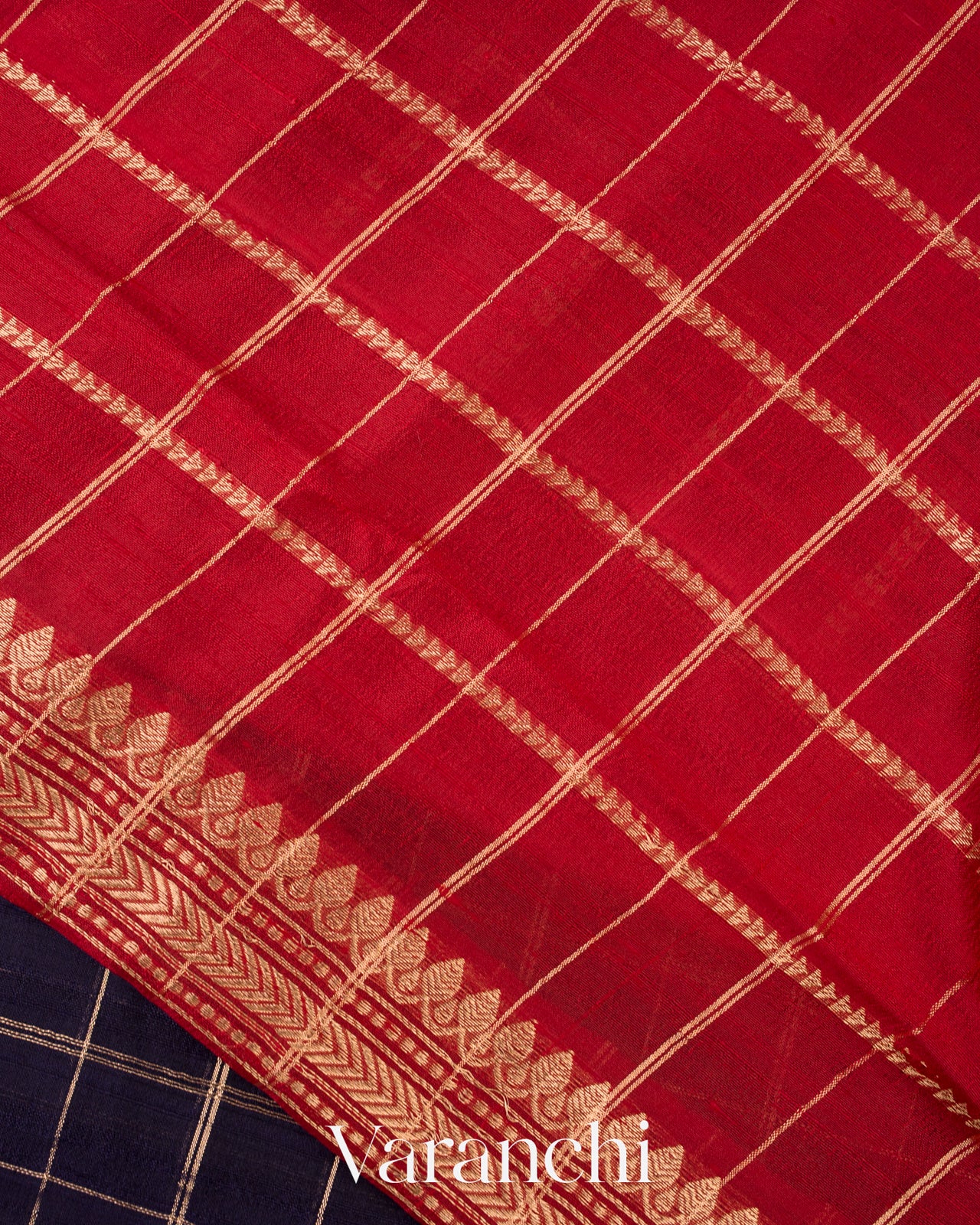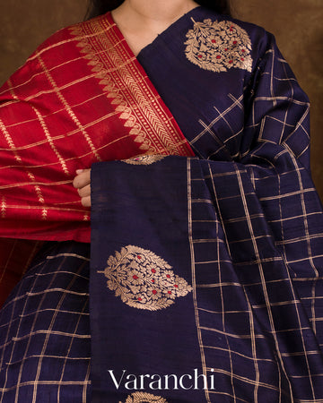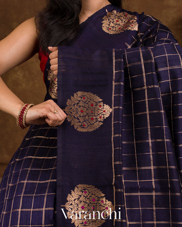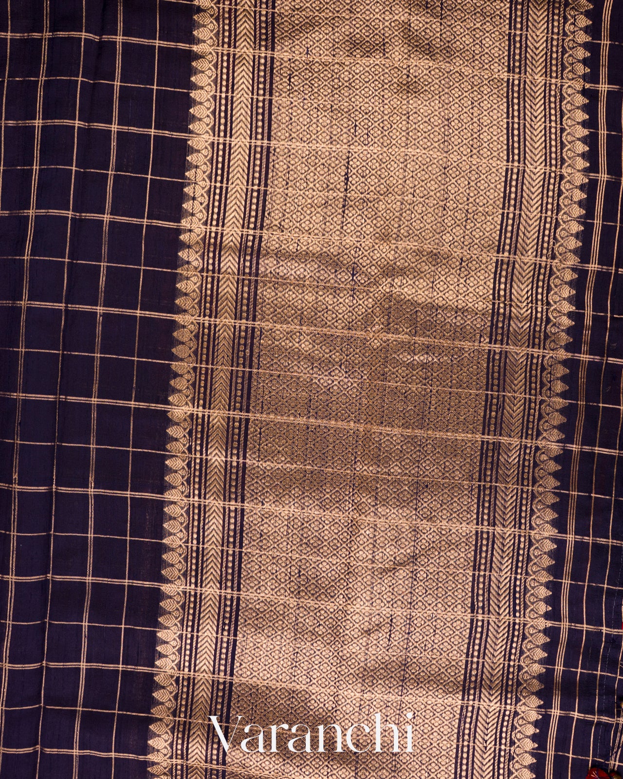 Midnight Navy Blue Checks Pure Raw Silk Handloom Saree