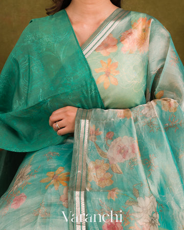 Misty Aqua Green Floral Printed Pure Tissue Kora Silk Saree