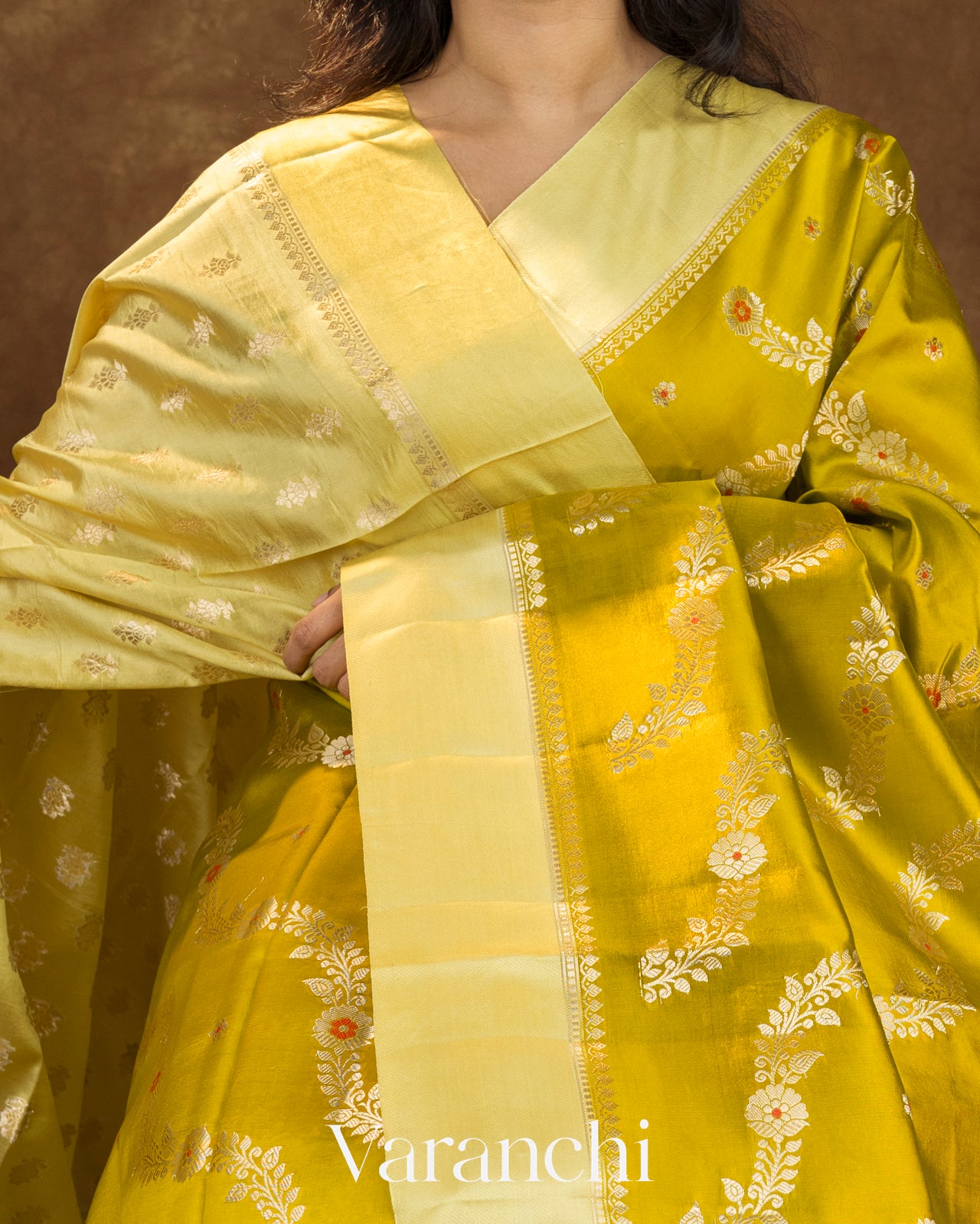 Olive Yellow Lehariya Pure Mango Silk Handloom Saree