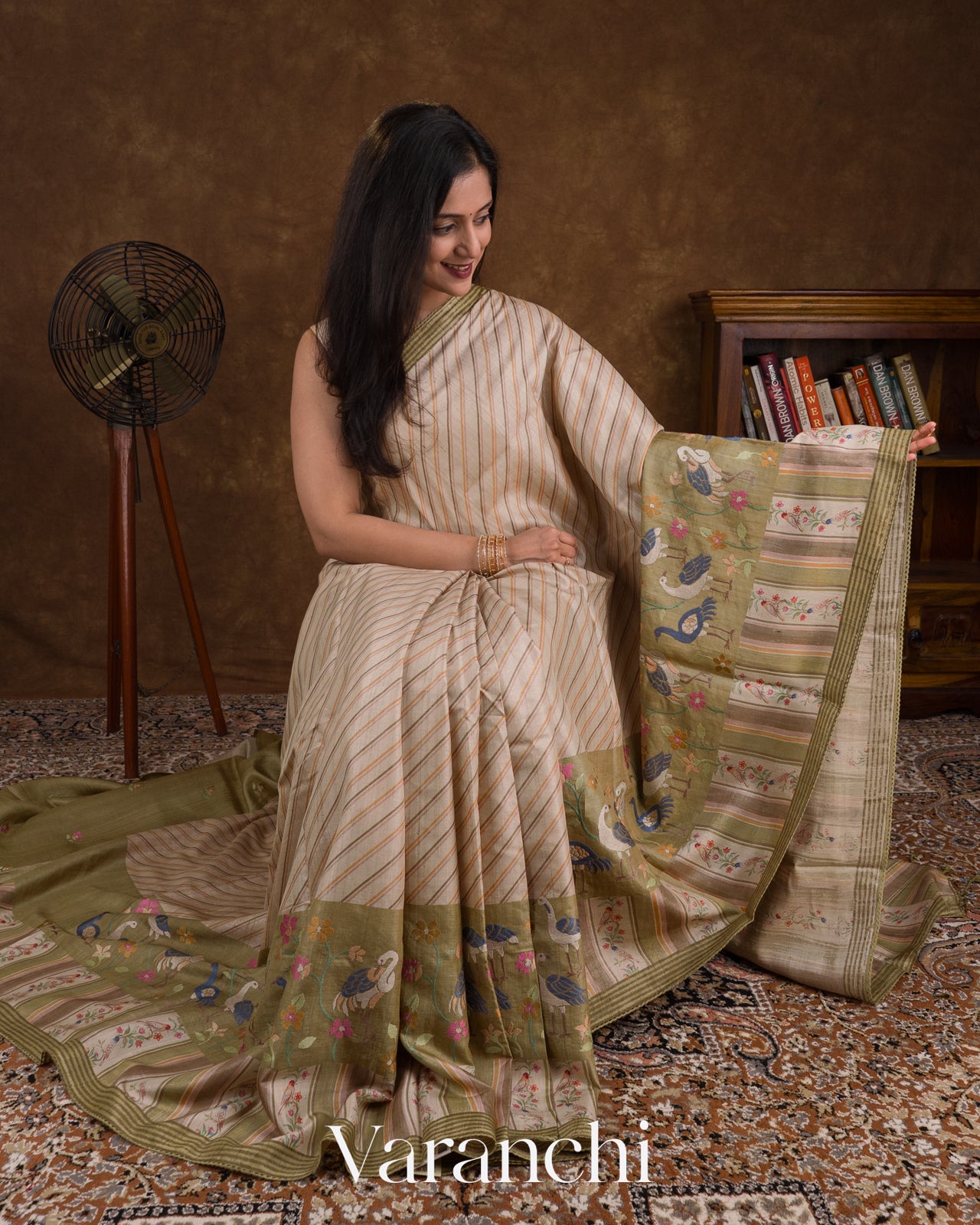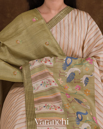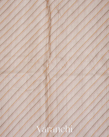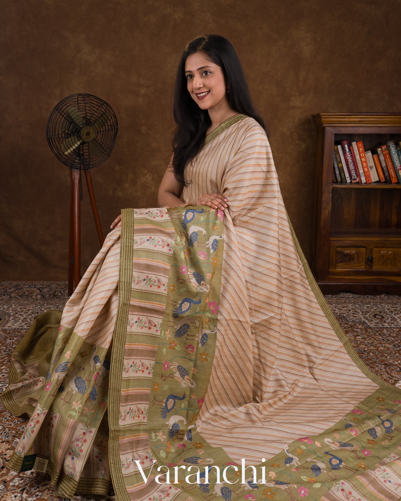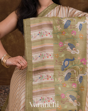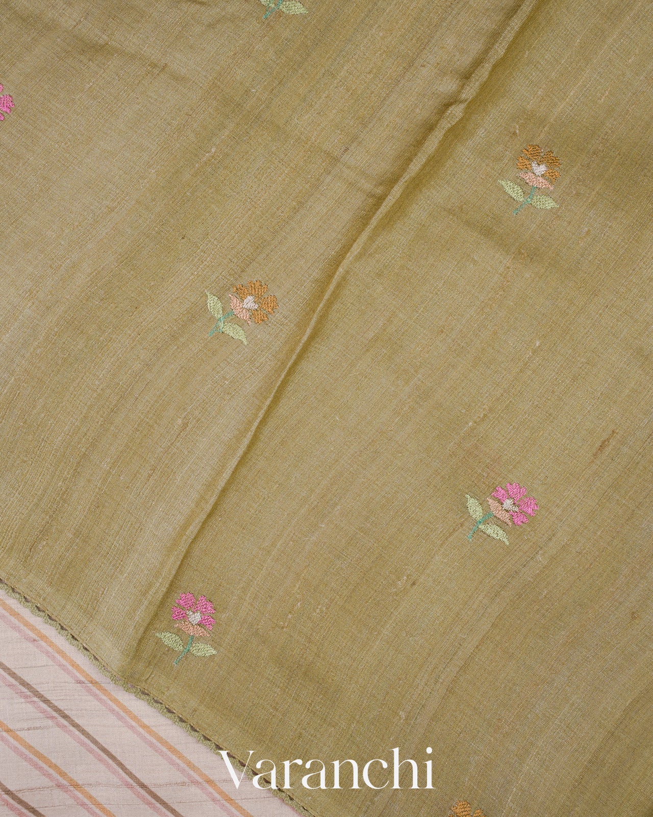 Off-White Lehariya and Floral Embroidered Pure Tussar Silk Saree