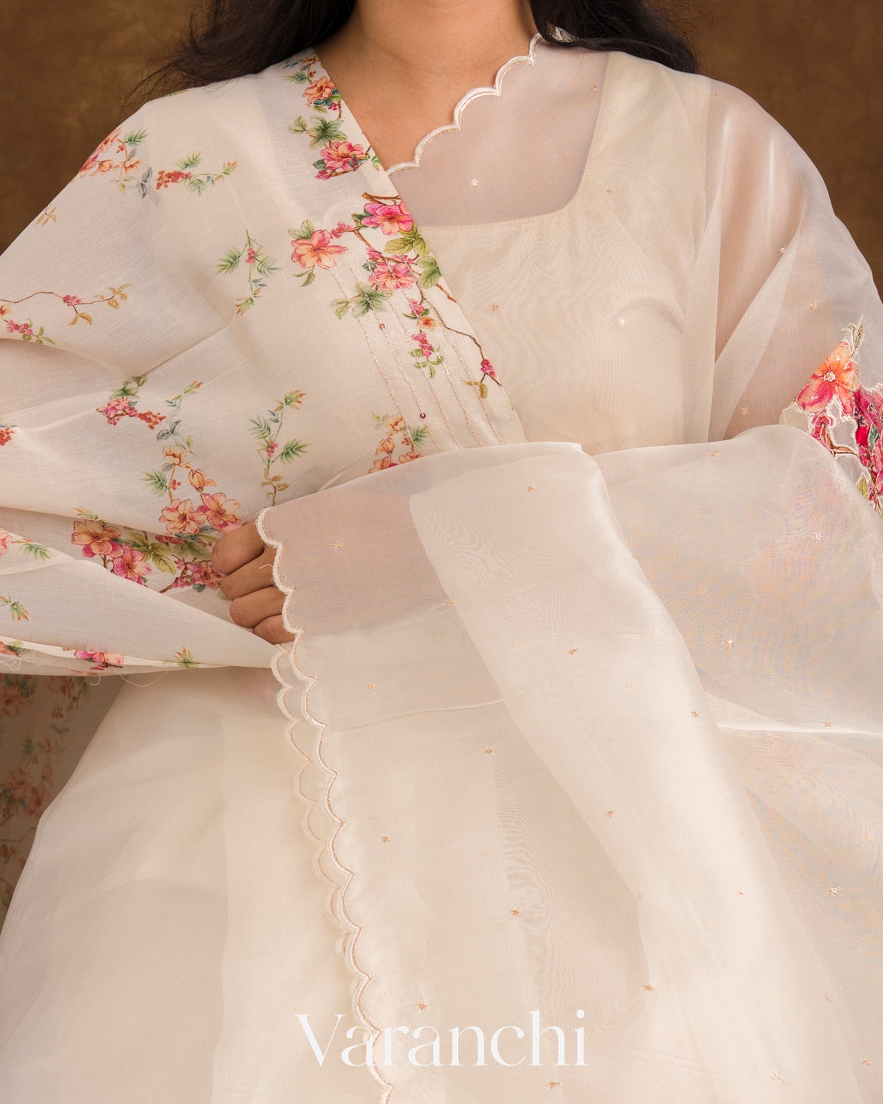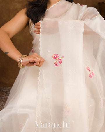 Off White Peacock Applique and Embroidered Pure Kora Silk Saree