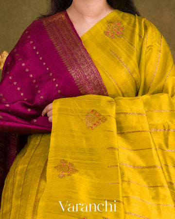 Olive Yellow Borderless Striped Pure Raw Silk Handloom Saree