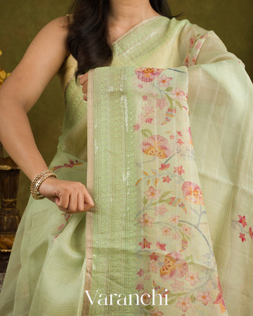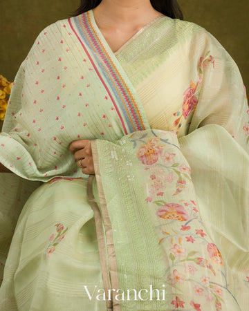 Pale Mint Embroidered and Digital Printed Pure Kora Silk Saree