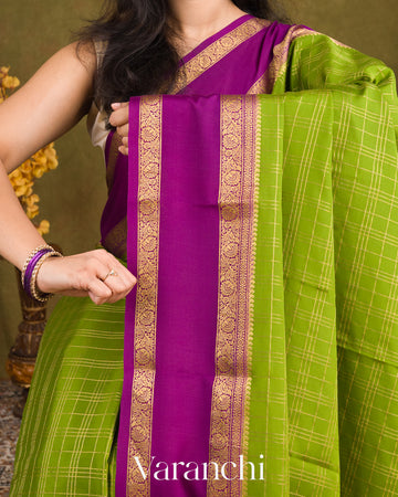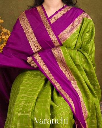 Parrot Green Checkered Pure Mysore Crepe Silk Saree
