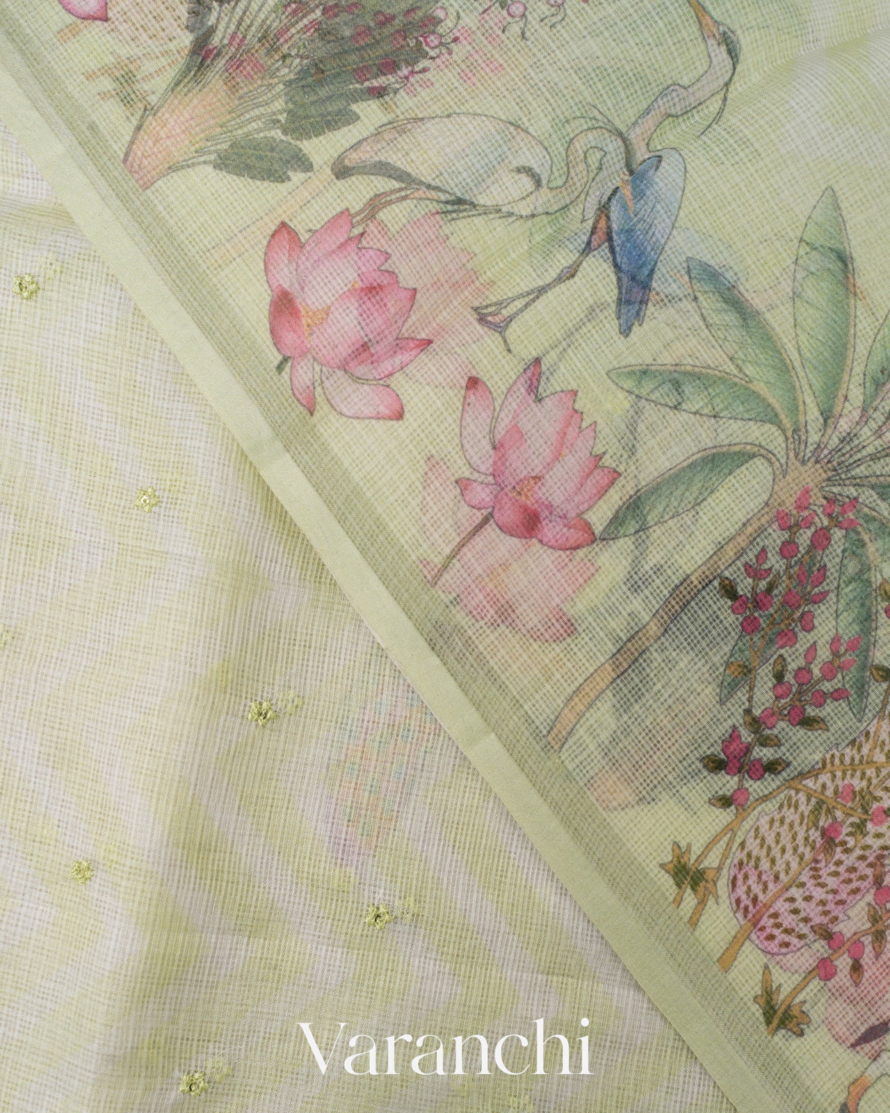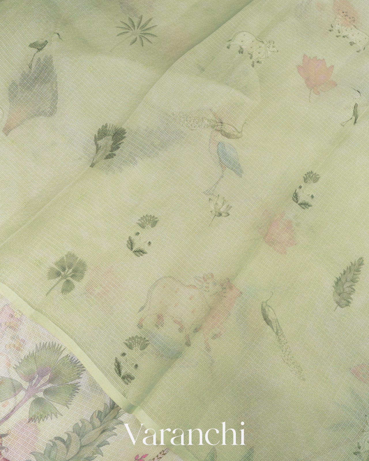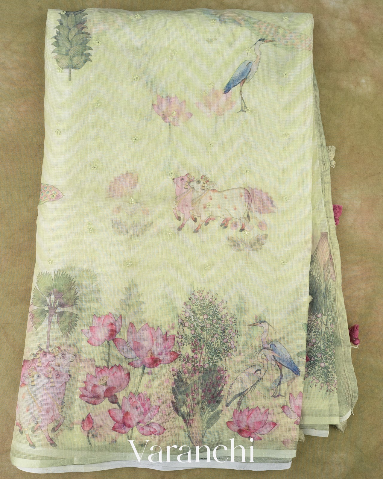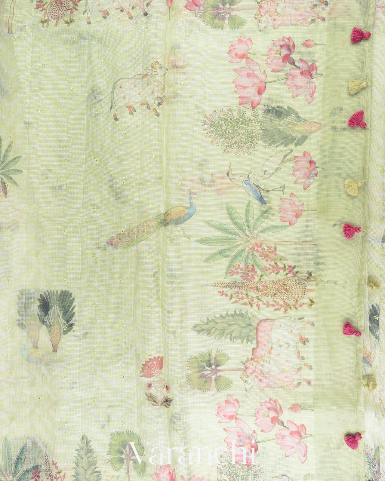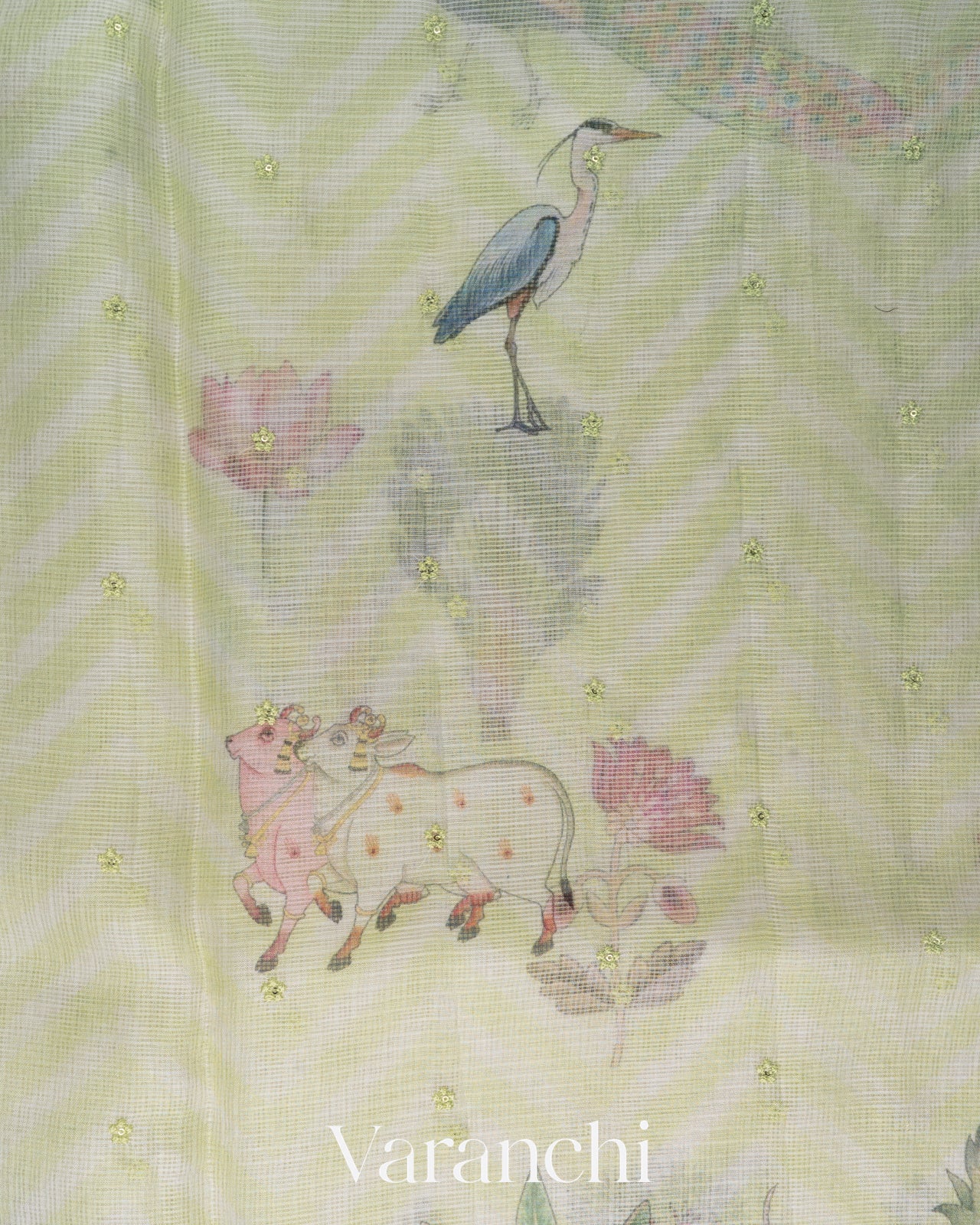 Pastel Green Embroidered and Pichwai Printed Pure Katan Kota Silk Handloom Saree