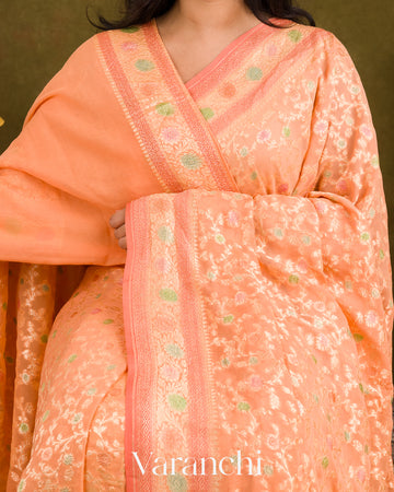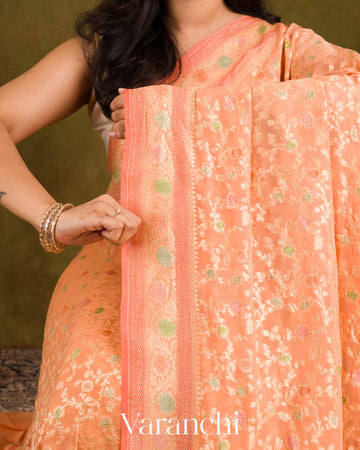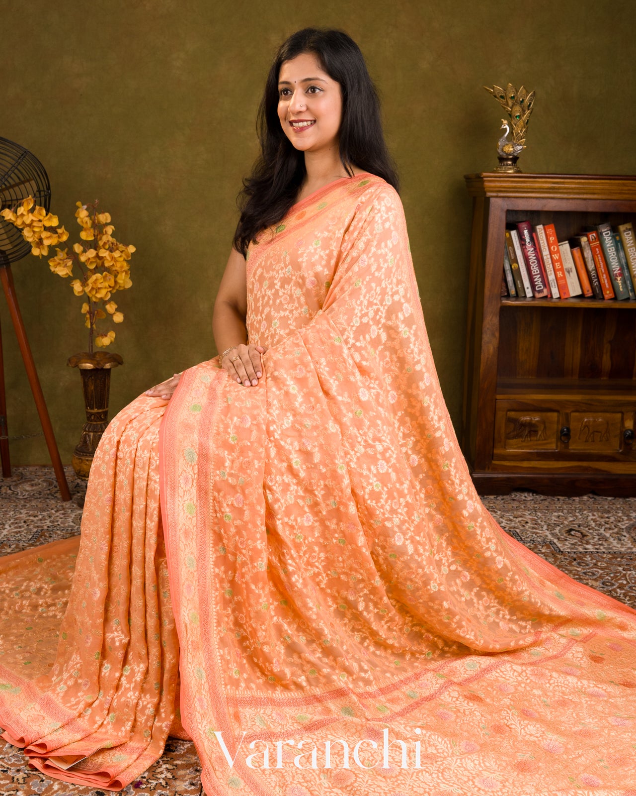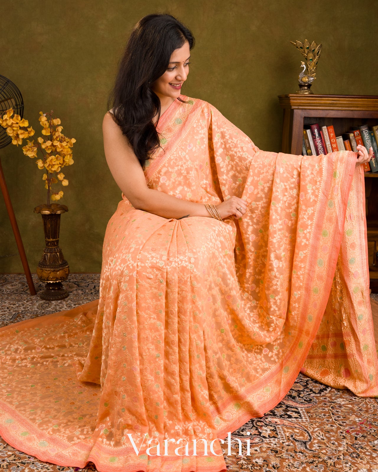 Peach Coral Pure Khaddi Georgette Silk Saree