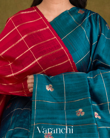 Peacock Blue Checks Pure Raw Silk Handloom Saree