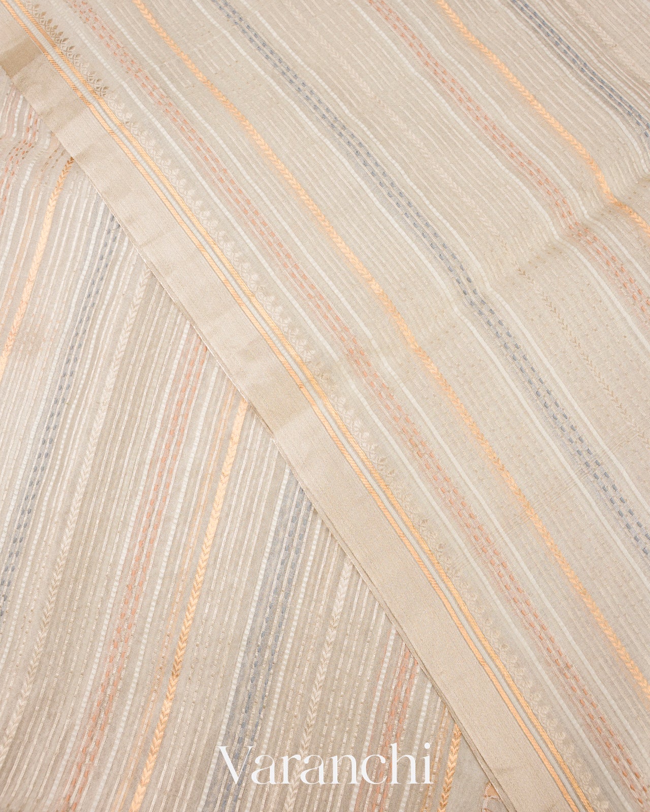 Pearl White Embroidered and Sandalwood Applique Pure Tissue Kora Silk Saree
