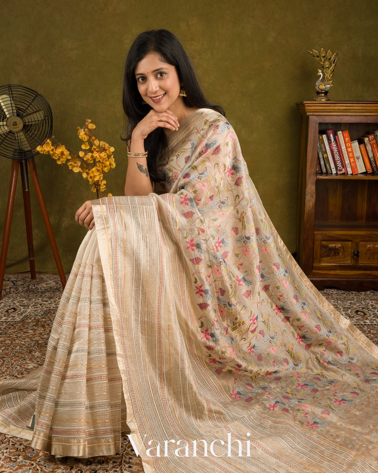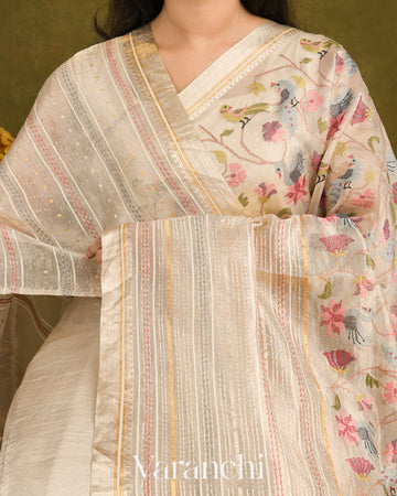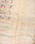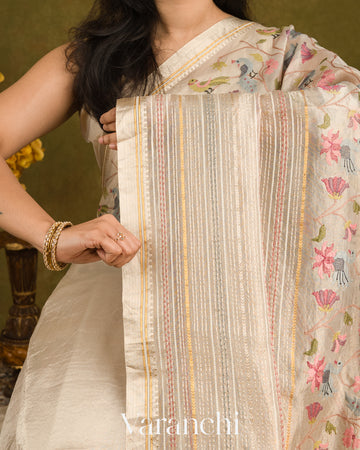Pearl White Paithani Embroidered Pure Tissue Kora Silk Saree