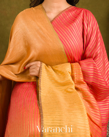 Coral Pink and Yellow Ombre-Dyed Pure Moonga Georgette Silk Handloom Saree