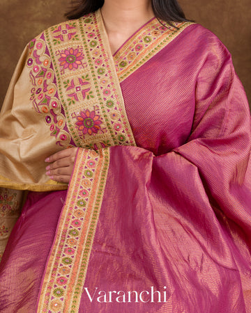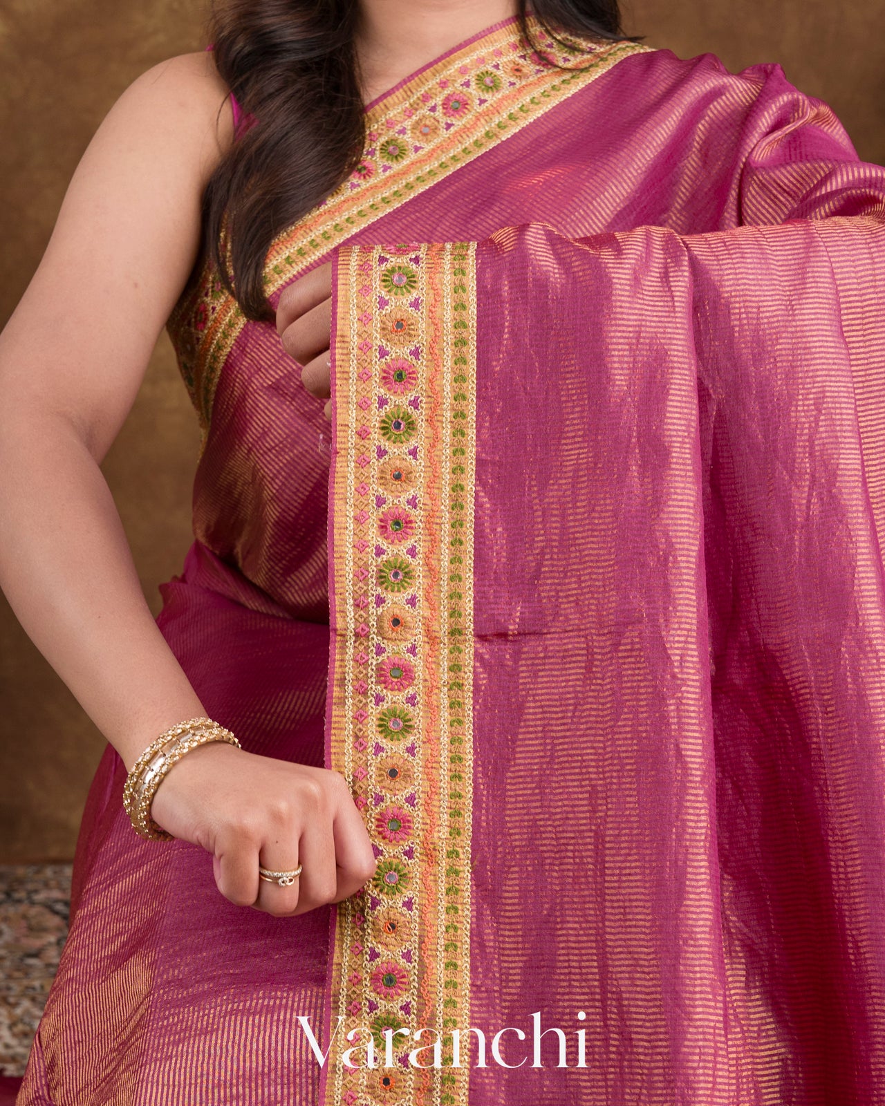 Berry Pink Tissue Striped Pure Kora Silk Handloom Saree