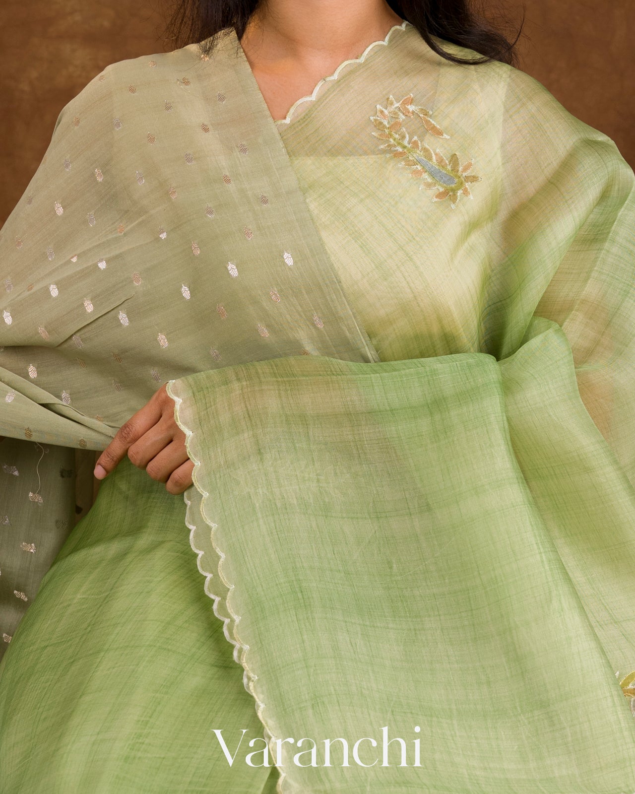 Pista Green Floral Applique and Embroidered Pure Kora Silk Saree